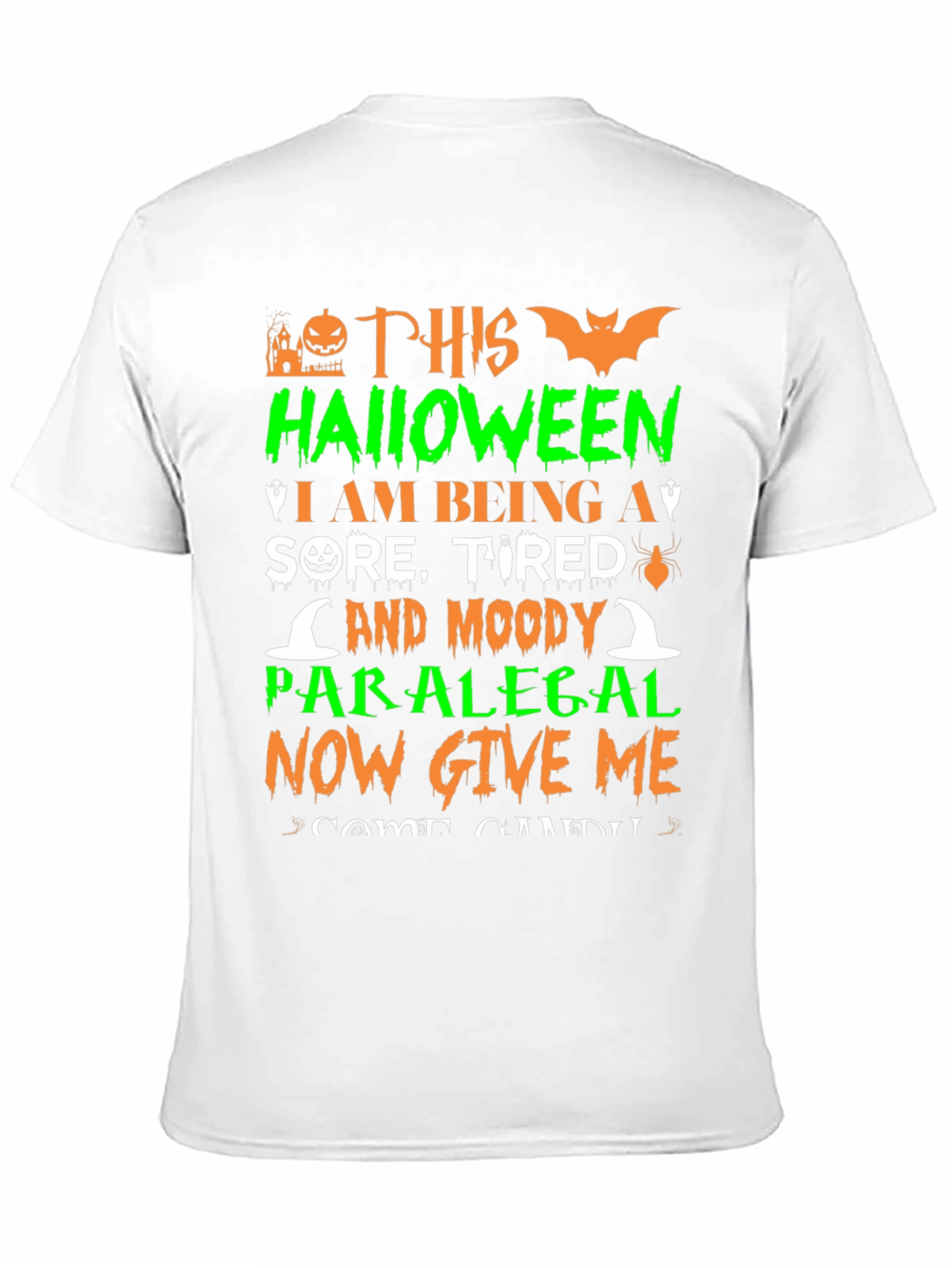 Embrace the Halloween spirit with this unique black t-shirt. The design features Halloween-themed graphics and humorous text that reads, "This Halloween I am being a sore, tired, and moody paralegal, now give me some candy." Perfect for paralegals with a sense of humor, this shirt is ideal for Halloween parties, casual wear, or as a fun gift. Made with comfortable materials, it ensures a great fit and feel. Stand out this Halloween and let everyone know what you need – candy!