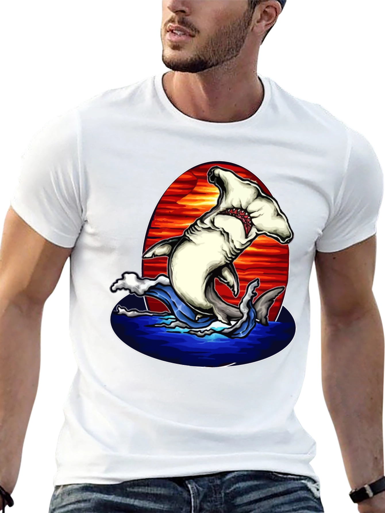 Dive into style with this unique black t-shirt featuring a striking graphic print. A fierce hammerhead shark leaps from the ocean waves against a vibrant sunset backdrop. The detailed artwork captures the shark's powerful form and the dynamic energy of the sea. Made from comfortable, breathable fabric, this tee is perfect for casual wear, beach outings, or expressing your love for marine life. Stand out from the crowd with this eye-catching design that's sure to spark conversation and showcase your adventurous spirit. Get yours today and ride the wave of fashion!
