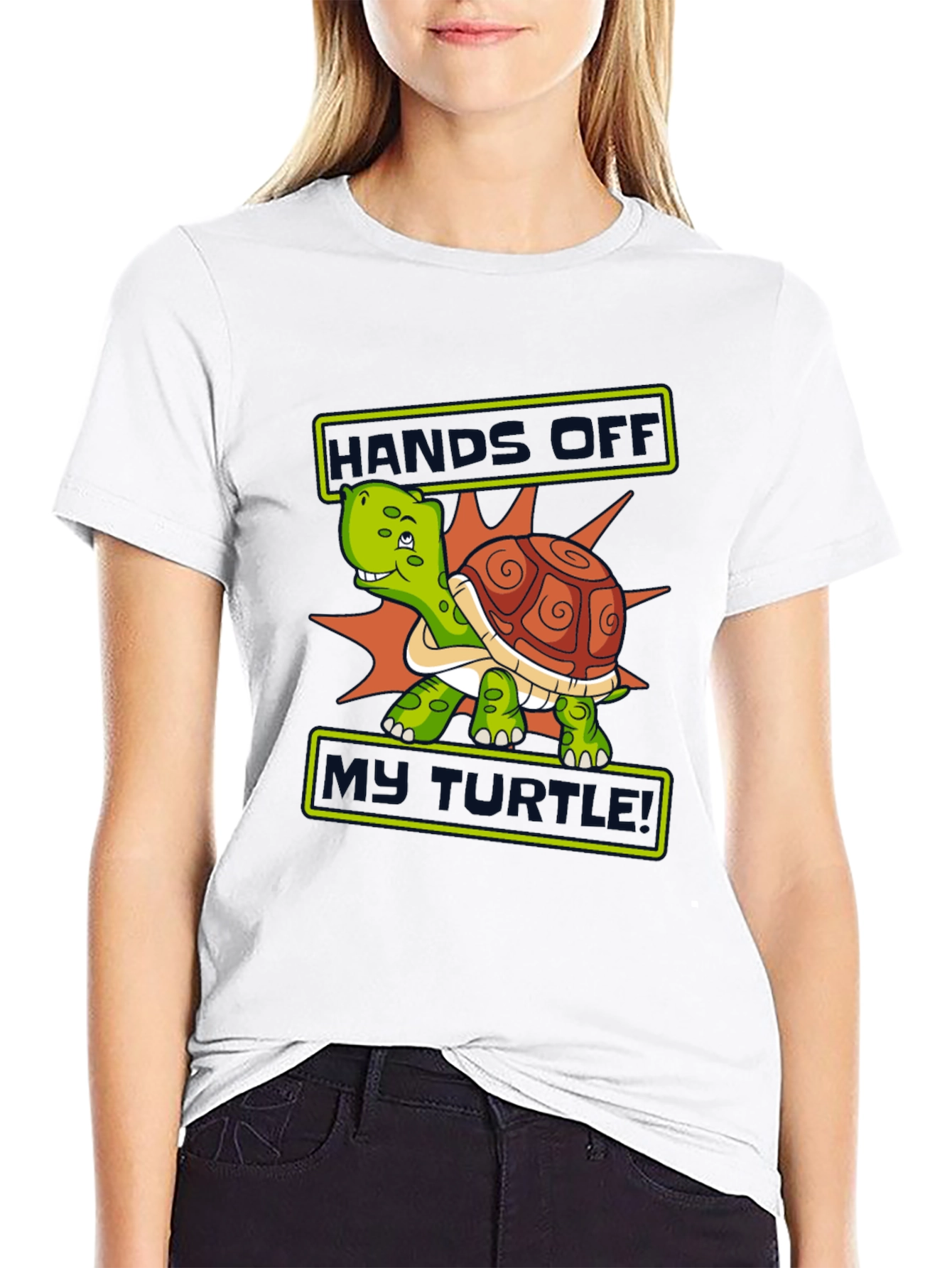 Show off your love for turtles with this unique graphic tee! The shirt features a cartoon turtle with a brown patterned shell, surrounded by a burst design. Above and below the turtle are bold green boxes displaying "HANDS OFF" and "MY TURTLE!" in a striking font. Made from a soft, comfortable material, this black t-shirt is perfect for casual wear. It's a great way to express your personality and make a statement. Ideal for animal lovers, turtle enthusiasts, or anyone who appreciates quirky designs. Pair it with jeans or shorts for a fun and relaxed look.