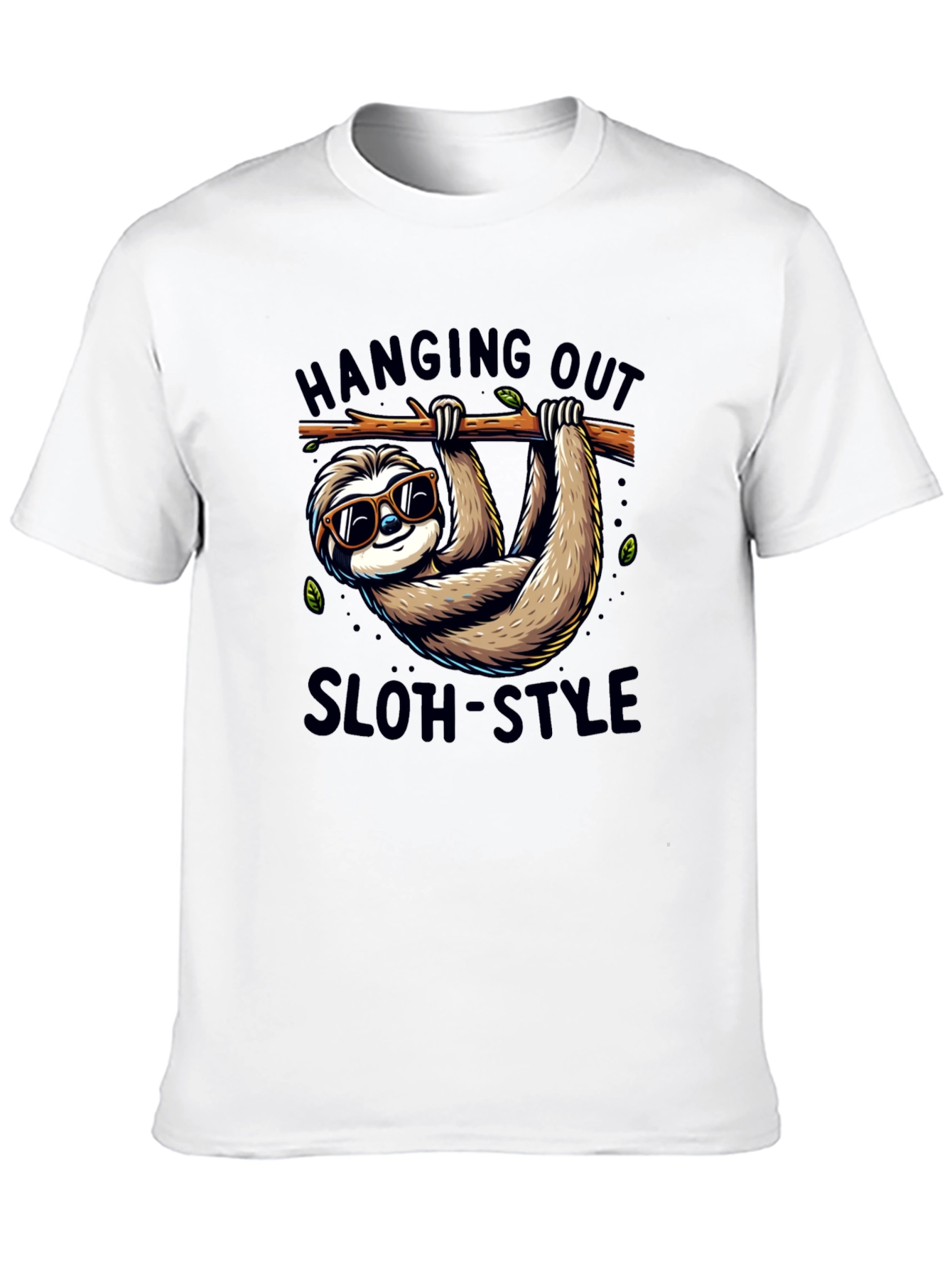 Stay relaxed with this cool black t-shirt! It features a funny cartoon sloth wearing sunglasses, casually hanging from a branch. The playful "Hanging Out Sloth-Style" text adds a touch of humor. Made from comfortable materials, this shirt is perfect for everyday wear, lounging around, or making a statement. Stand out from the crowd with this unique and fun design. It's ideal for casual outings, movie nights, or just expressing your laid-back personality. Show off your love for sloths with this stylish shirt!