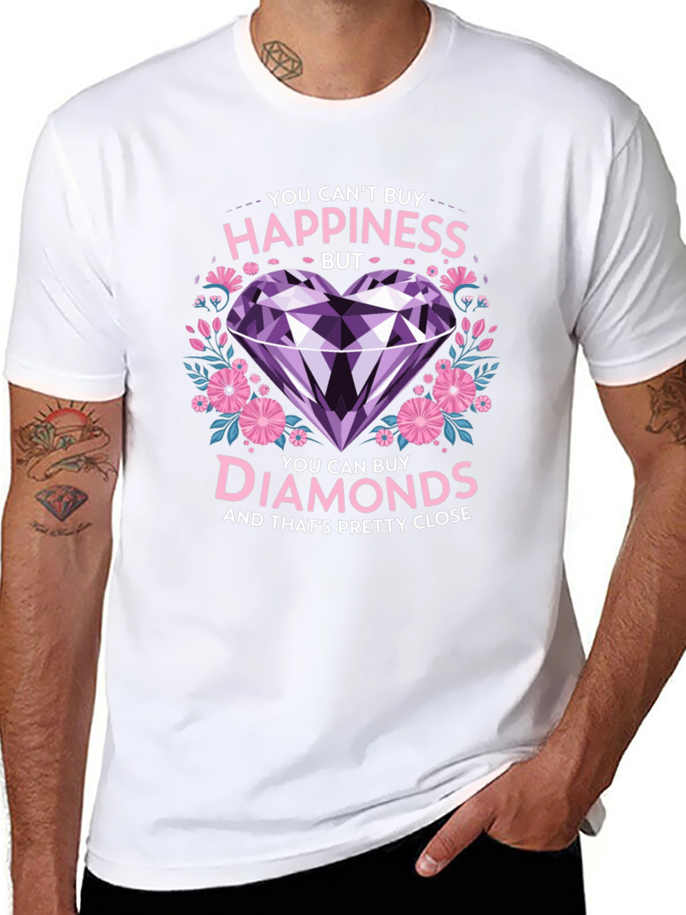 This T-shirt is perfect for those who love diamonds! Featuring the saying "You can't buy happiness, but you can buy diamonds and that's pretty close" with a graphic of a big purple heart-shaped diamond surrounded by flowers, this shirt is sure to make a statement. Made from a soft, comfortable fabric, this tee is perfect for everyday wear. Dress it up or down, and show off your love for diamonds. The shirt features a classic crew neck and short sleeves for a versatile fit. It's a fun and trendy piece that adds a touch of sparkle to any outfit.
