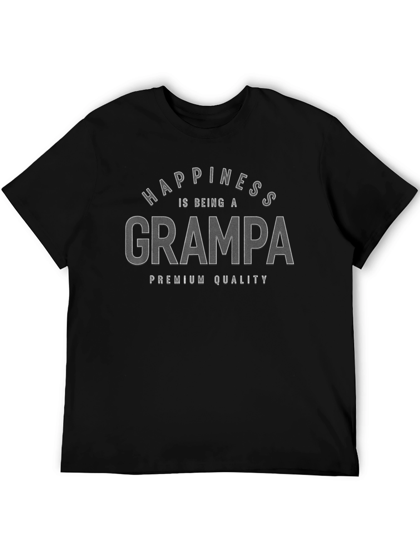 Show your pride and joy with this classic black t-shirt. The shirt features the phrase "Happiness is being a Grampa" in a stylish, slightly distressed font, followed by "Premium Quality." Made from what appears to be a soft and breathable cotton blend, this tee offers both comfort and durability. The design is simple, yet eye-catching, making it a versatile addition to any wardrobe. Perfect for casual outings, family gatherings, or simply relaxing at home. This t-shirt makes an excellent gift for grandfathers who cherish their role.