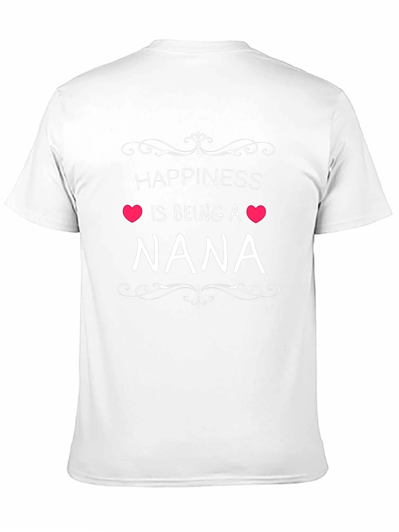 Show your love for being a Nana with this stylish black t-shirt! The design features the phrase "HAPPINESS IS BEING A NANA" in a playful white font, adorned with decorative flourishes and cute pink hearts. Made from a comfortable-looking fabric, this tee is perfect for casual wear, family gatherings, or as a thoughtful gift for your favorite Nana. Let the world know how much you cherish your Nana status with this heartwarming and fashionable t-shirt. Available in various sizes for a perfect fit.