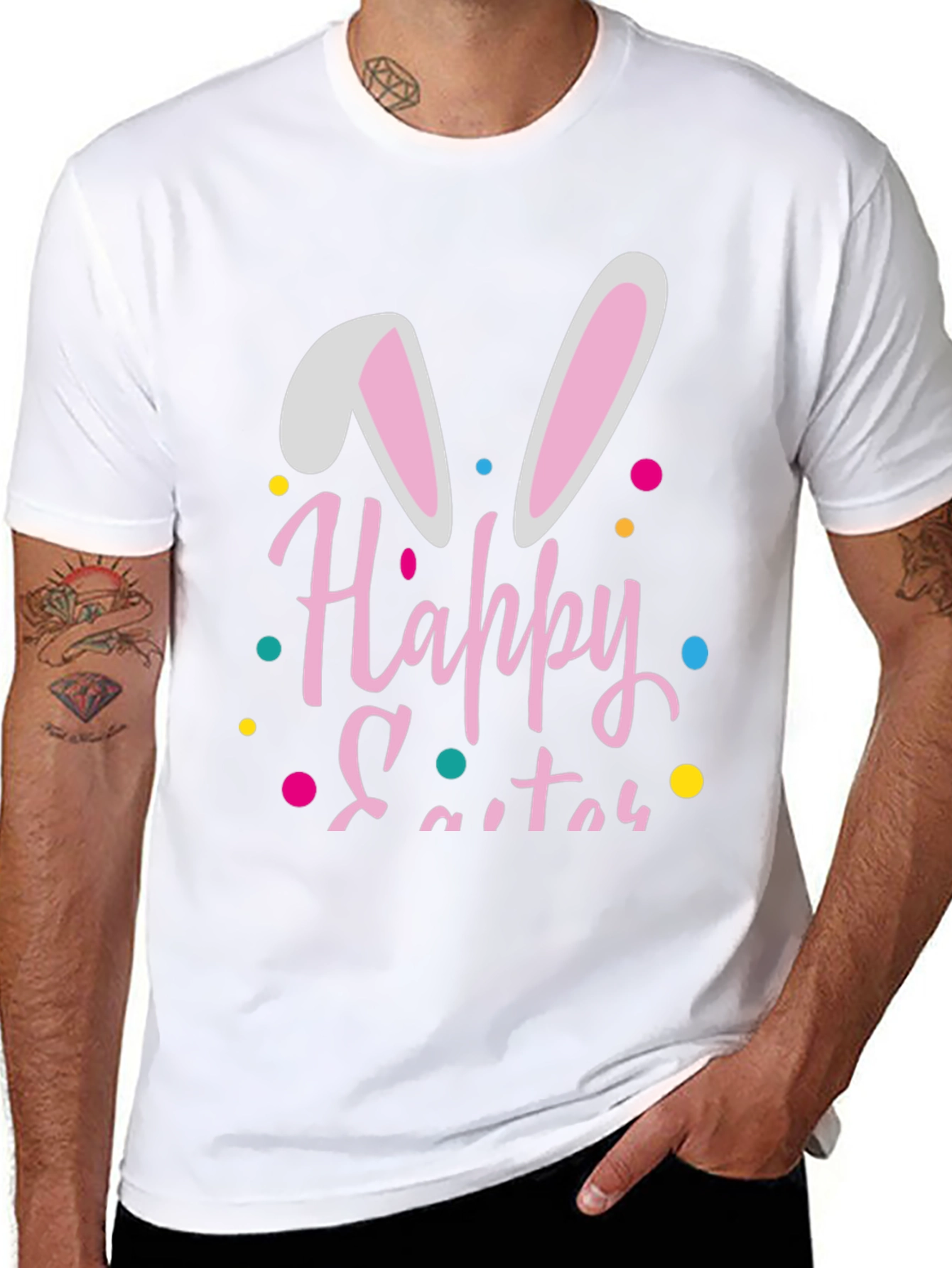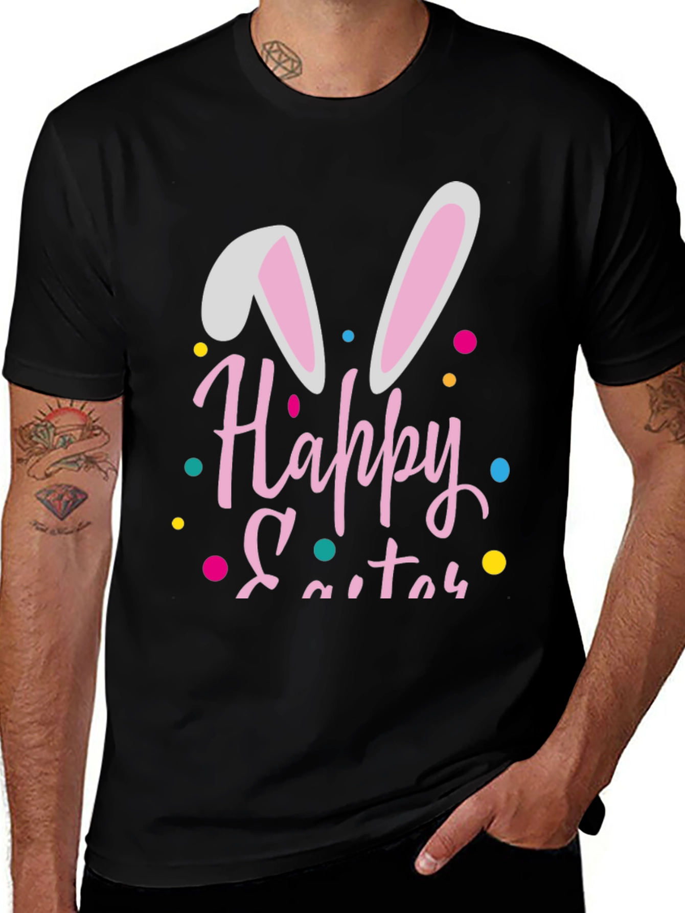Celebrate Easter in style with this festive black T-shirt! The design features adorable bunny ears above the words "Happy Easter" in a playful pink font. Colorful polka dots scattered around the design add a fun and cheerful touch. Made from a comfortable-looking fabric, this tee is perfect for casual wear during the Easter season. Show off your holiday spirit at egg hunts, family gatherings, or while simply enjoying the spring weather. A must-have addition to your Easter wardrobe that's sure to spread joy and smiles.