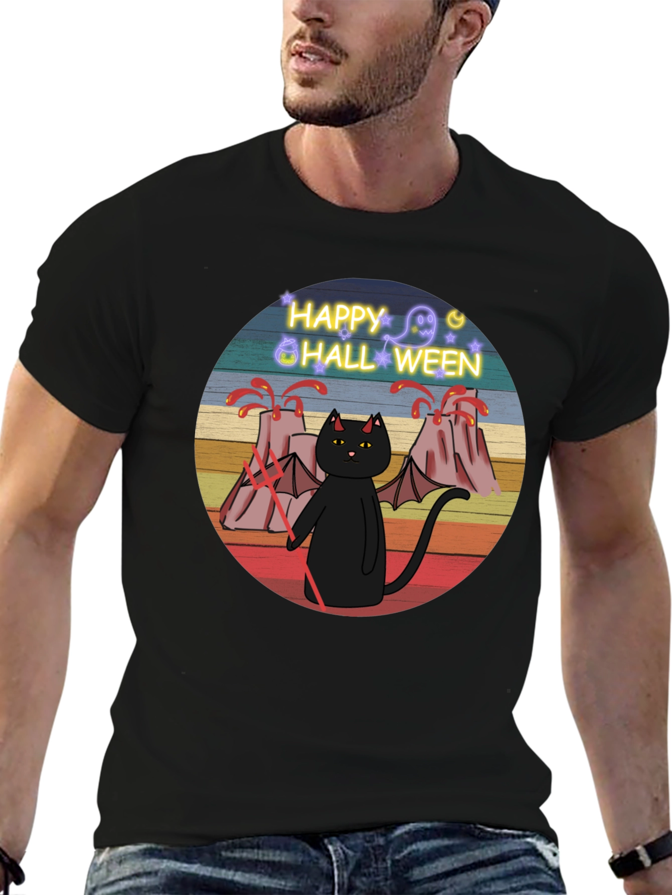 Show your spooky spirit with this unique Halloween T-shirt! The black tee features a colorful circular design with a cute black cat wearing devil horns and bat wings in front of volcanoes. Above the cat are the neon words "Happy Halloween" with a ghost. Made from comfortable, breathable fabric, this T-shirt is perfect for Halloween parties, casual wear, or everyday fun. Grab yours and celebrate Halloween in style!