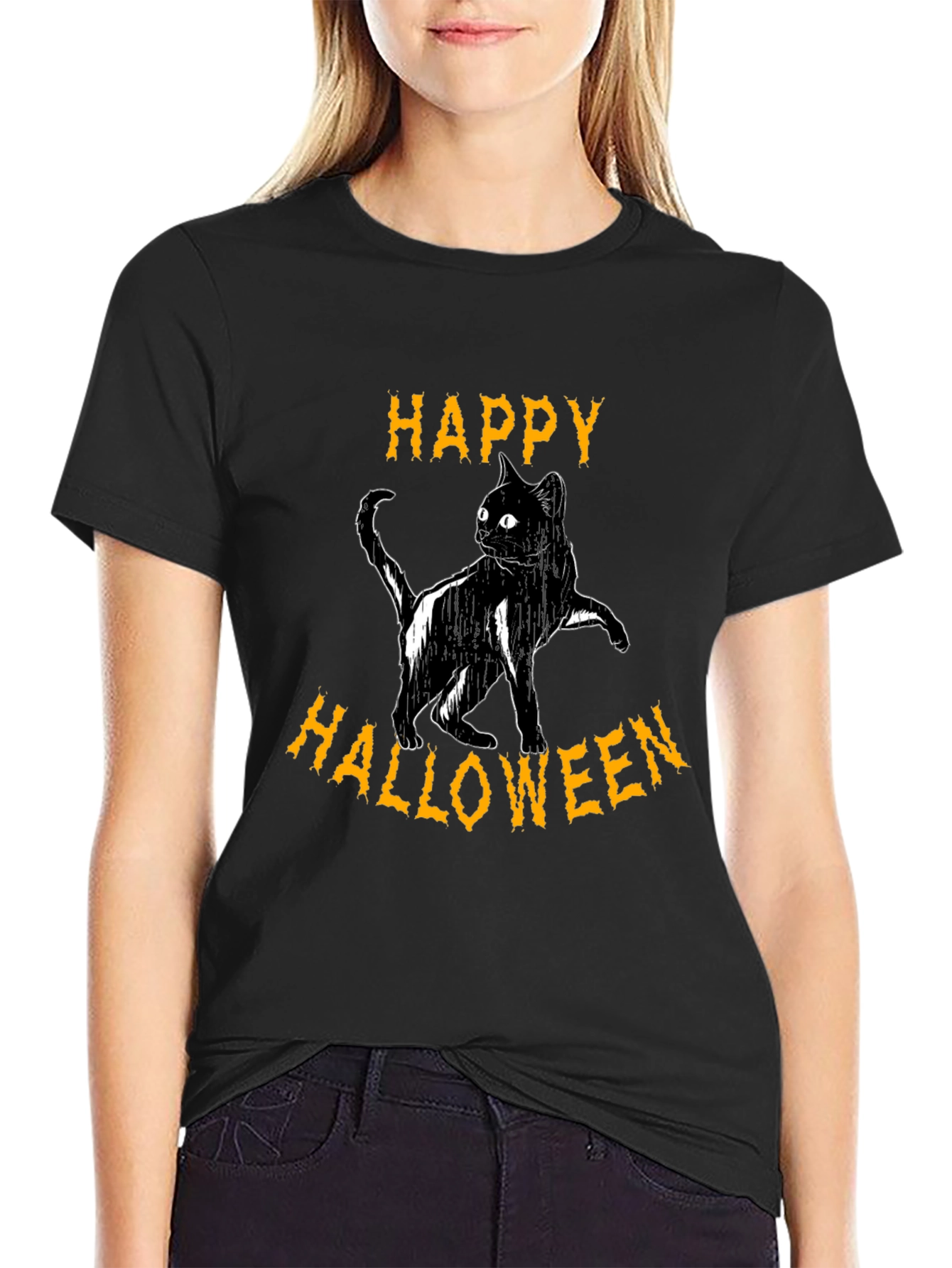 Happy Halloween Cat T-Shirt - Black Cotton Graphic Tee