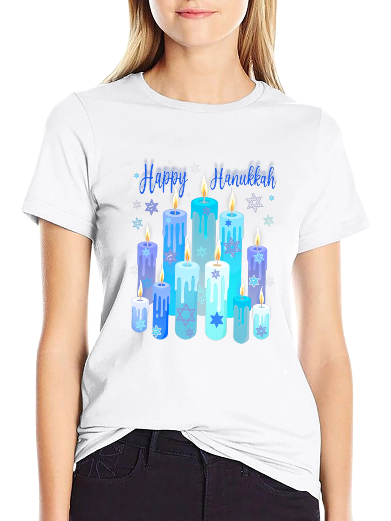 Celebrate Hanukkah in style with this unique graphic t-shirt! The shirt features a vibrant design of Hanukkah candles in shades of blue. 'Happy Hanukkah' is written above the candles in a festive font. The tee is made from a soft, comfortable fabric, perfect for all-day wear during holiday celebrations. Show your Hanukkah spirit with this eye-catching and joyful t-shirt. Ideal for family gatherings, holiday parties, or casual wear throughout the Hanukkah season.
