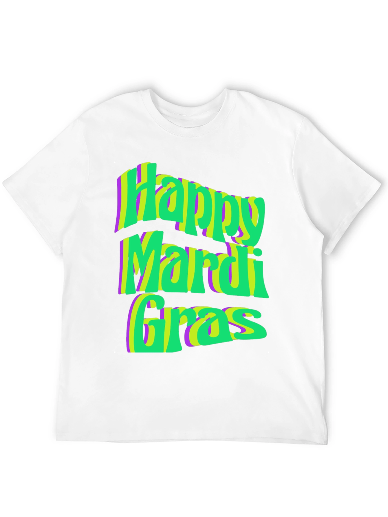 Celebrate Mardi Gras in style with this vibrant t-shirt! The black tee features a bold, eye-catching graphic print of "Happy Mardi Gras" in festive green, yellow, and purple hues. The design has a unique, layered effect that adds depth and dimension. Made from a comfortable, breathable fabric, this shirt is perfect for wearing to parades, parties, or any Mardi Gras celebration. Show off your holiday spirit with this fun and stylish t-shirt that's sure to turn heads.