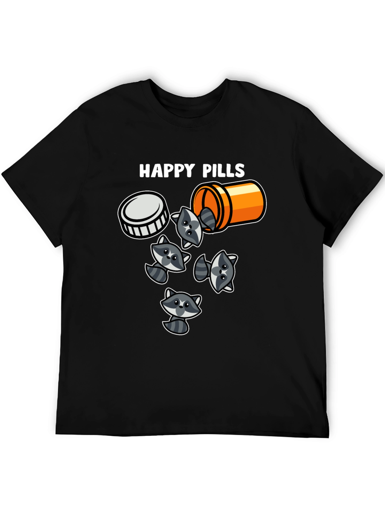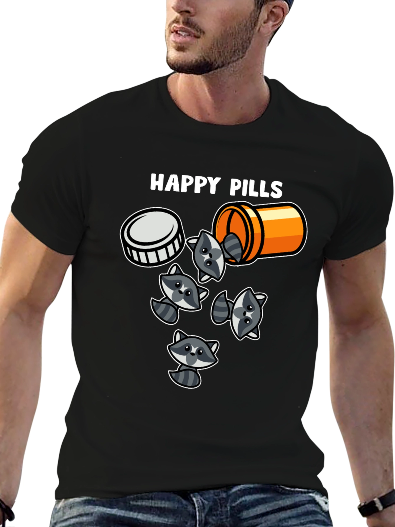 This fun black t-shirt features a playful design of a pill bottle labeled "Happy Pills" with adorable cartoon raccoons spilling out. The shirt is made from a comfortable-looking fabric, ideal for casual wear. The humorous graphic is sure to bring a smile to anyone's face, making it a great conversation starter. This tee is perfect for animal lovers, those with a lighthearted sense of humor, or anyone who enjoys unique and quirky apparel. Wear it for everyday errands, social gatherings, or just lounging around in comfort and style.