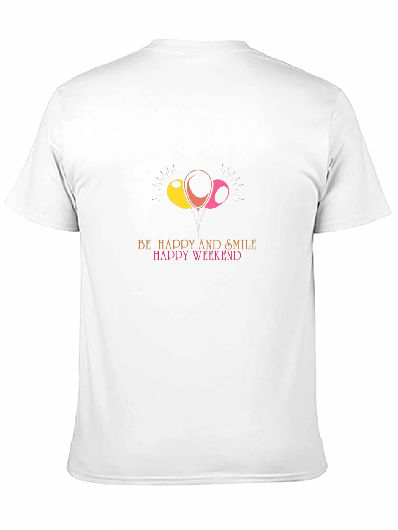 Spread positivity with this stylish black graphic tee. Featuring a vibrant balloon design and the cheerful message "Be Happy and Smile, Happy Weekend", this shirt is perfect for casual outings or relaxing at home. The soft fabric ensures all-day comfort, while the classic fit makes it a versatile addition to any wardrobe. Wear it on weekends, holidays, or whenever you want to inject a dose of happiness into your day. It's the perfect conversation starter and a great way to express your optimistic outlook. Made with quality materials for lasting wear. Get yours today!