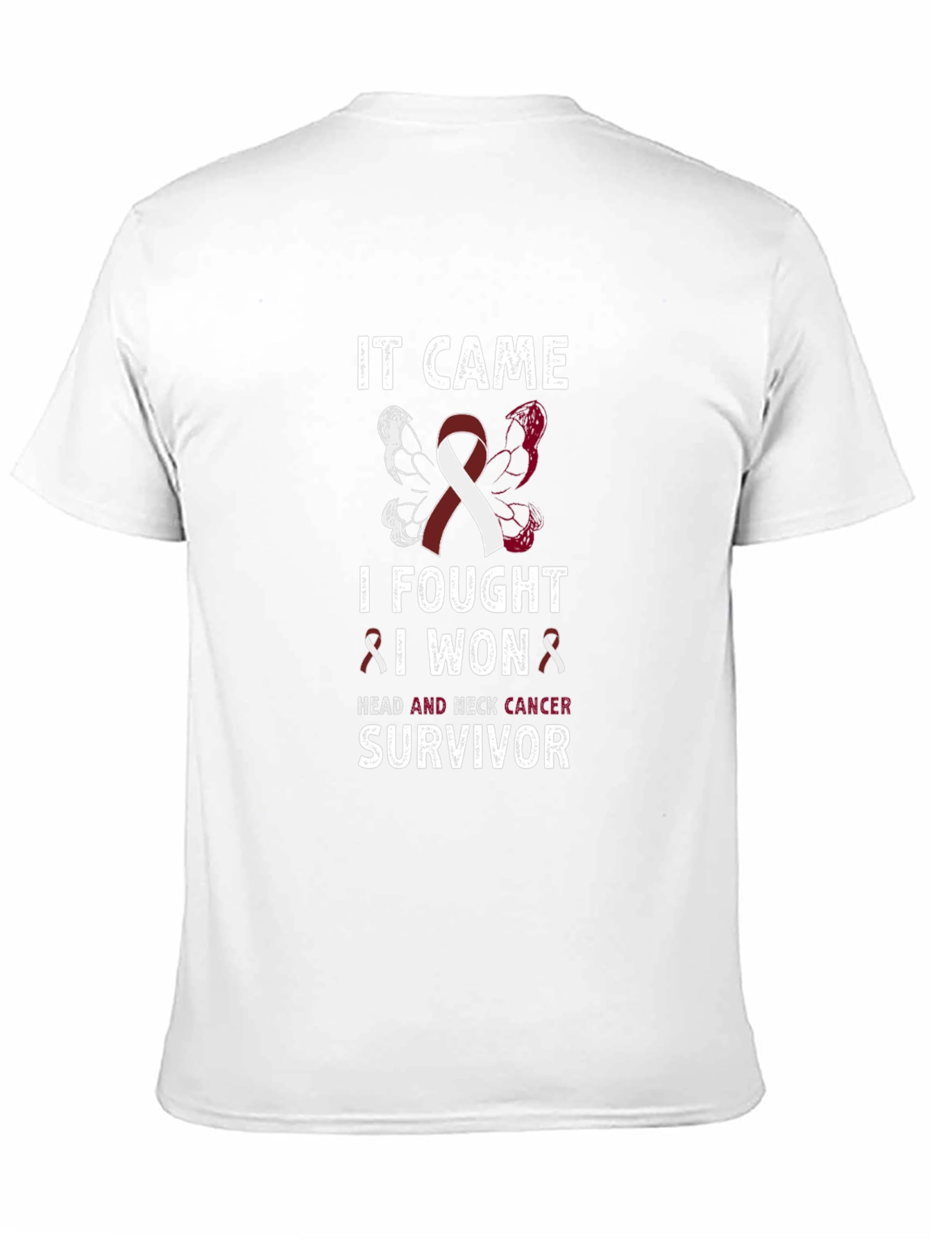 Show your strength and resilience with this black graphic t-shirt. Featuring a bold design, the shirt showcases a ribbon symbolizing Head and Neck Cancer awareness, flanked by fists to represent the fight. The powerful message "It Came I Fought I Won, Head and Neck Cancer Survivor" is prominently displayed, making it a perfect way to celebrate survivorship and inspire others. Comfortable and stylish, this t-shirt is ideal for everyday wear, support events, or as a meaningful gift for survivors. Declare victory over cancer with this inspiring and empowering tee.