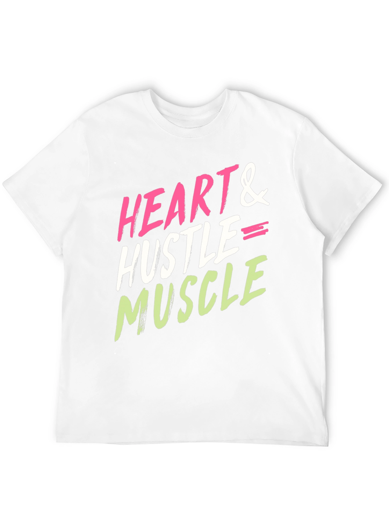 Elevate your casual style with this eye-catching graphic tee! Featuring the bold statement "Heart & Hustle = Muscle" in a vibrant pink, white, and green, this shirt makes a statement. Made from a soft cotton blend, this classic fit tee provides all-day comfort and breathability. The black backdrop accentuates the bright text, making it a versatile piece for workouts, casual hangouts, or layering. Express your drive and dedication with this unique and motivational t-shirt. Perfect for the gym enthusiast or anyone striving for success!