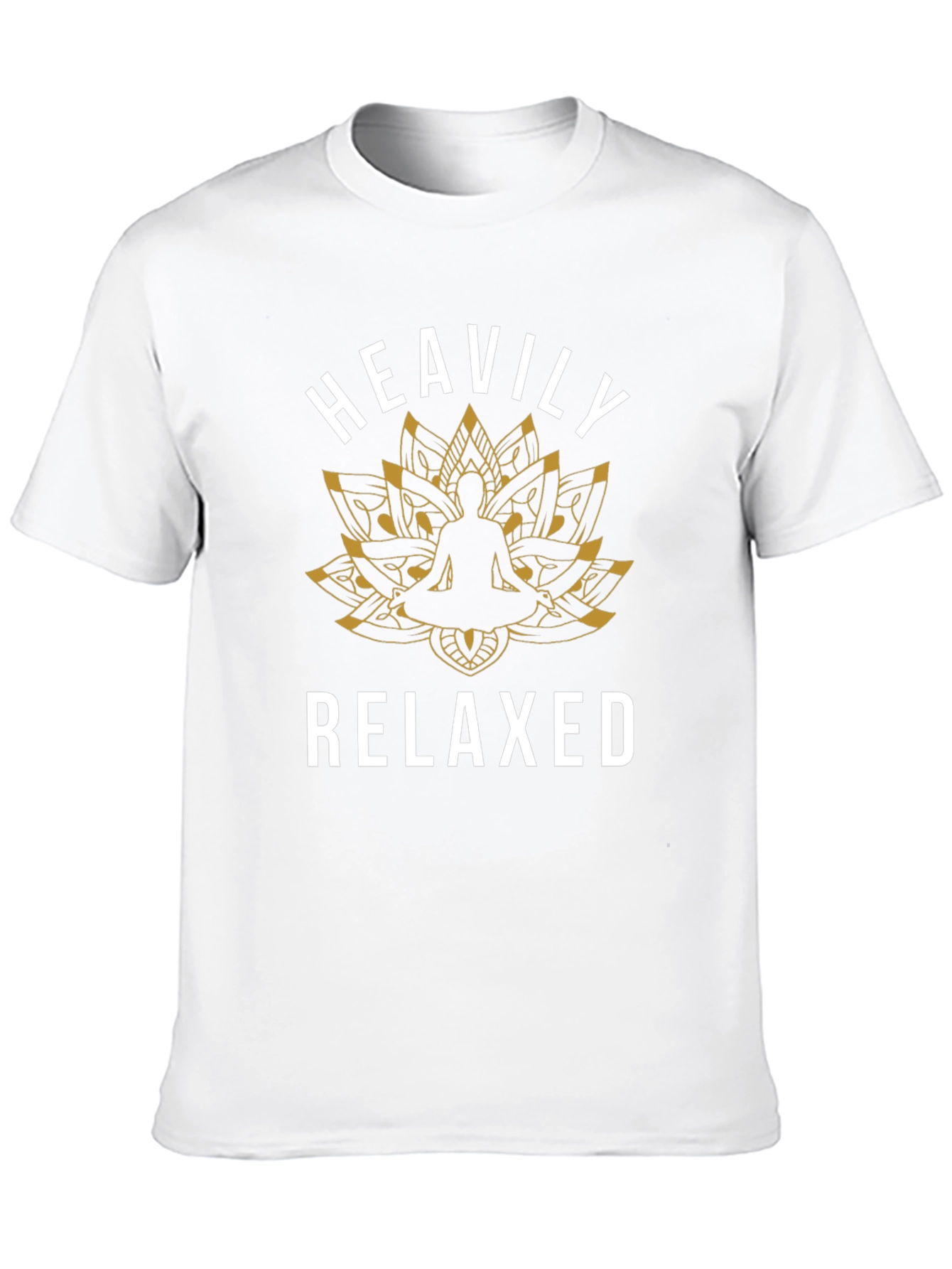 Find your inner peace with this comfortable black t-shirt featuring a gold-colored lotus flower design with a meditating figure at the center. 'Heavily Relaxed' is printed above and below the lotus, creating a calming aesthetic. Made from a soft-looking fabric, this tee is perfect for yoga sessions, meditation, or simply lounging at home. The classic crew neck and short sleeves offer a relaxed fit for all-day wear. This unique graphic tee will bring a touch of zen to your wardrobe. Get yours today!