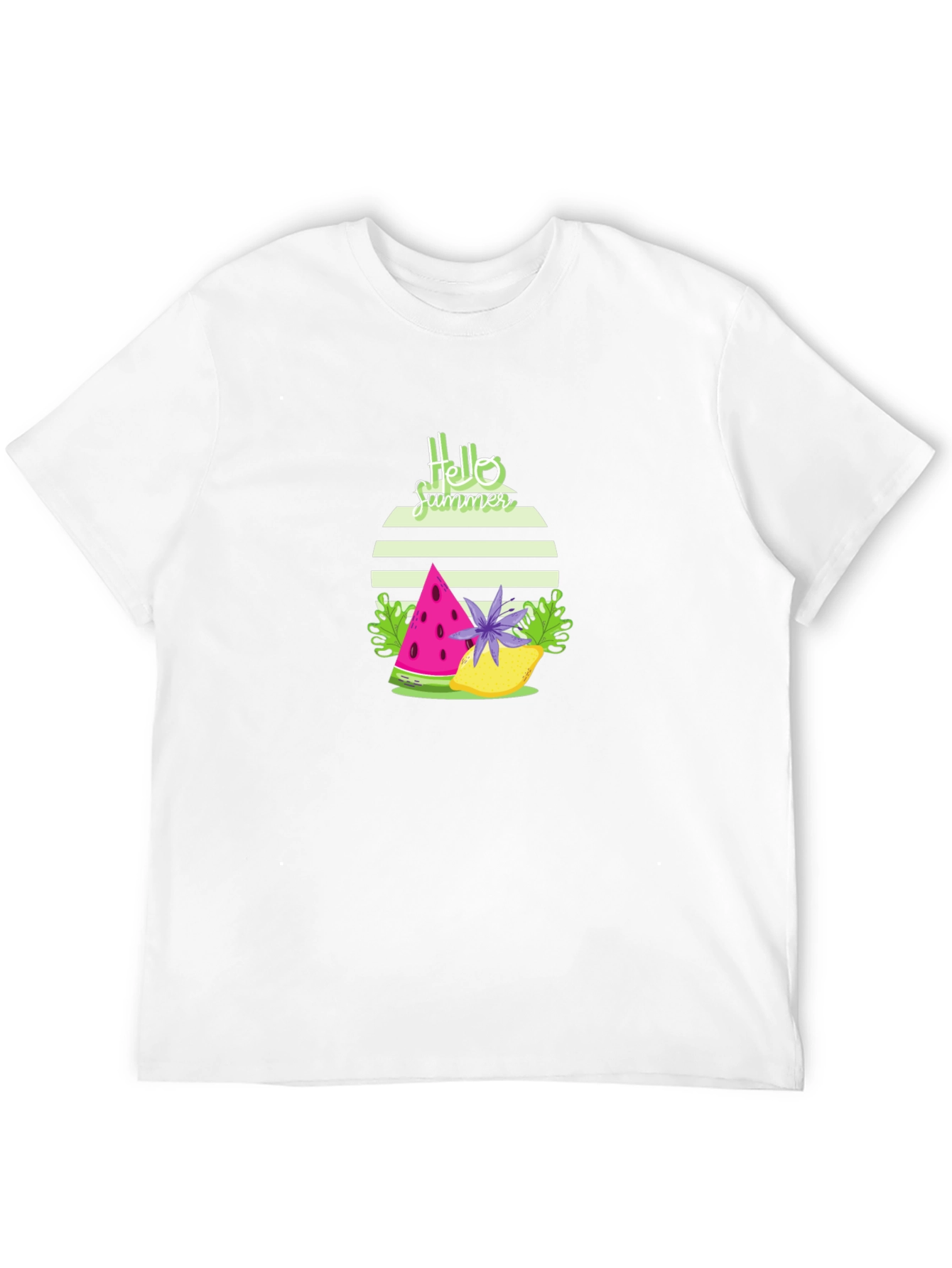 Embrace the warmth with our 'Hello Summer' graphic tee! This stylish black t-shirt features a vibrant and playful design, perfect for casual outings. The graphic showcases a refreshing mix of summer fruits like watermelon and lemon, complemented by tropical leaves and the cheerful 'Hello Summer' text. Ideal for those who love summer vibes, this tee offers a comfortable fit and a cool, eye-catching look. Perfect for beach days, picnics, or simply adding a touch of summer to your everyday style. Grab yours and let the sunshine in!