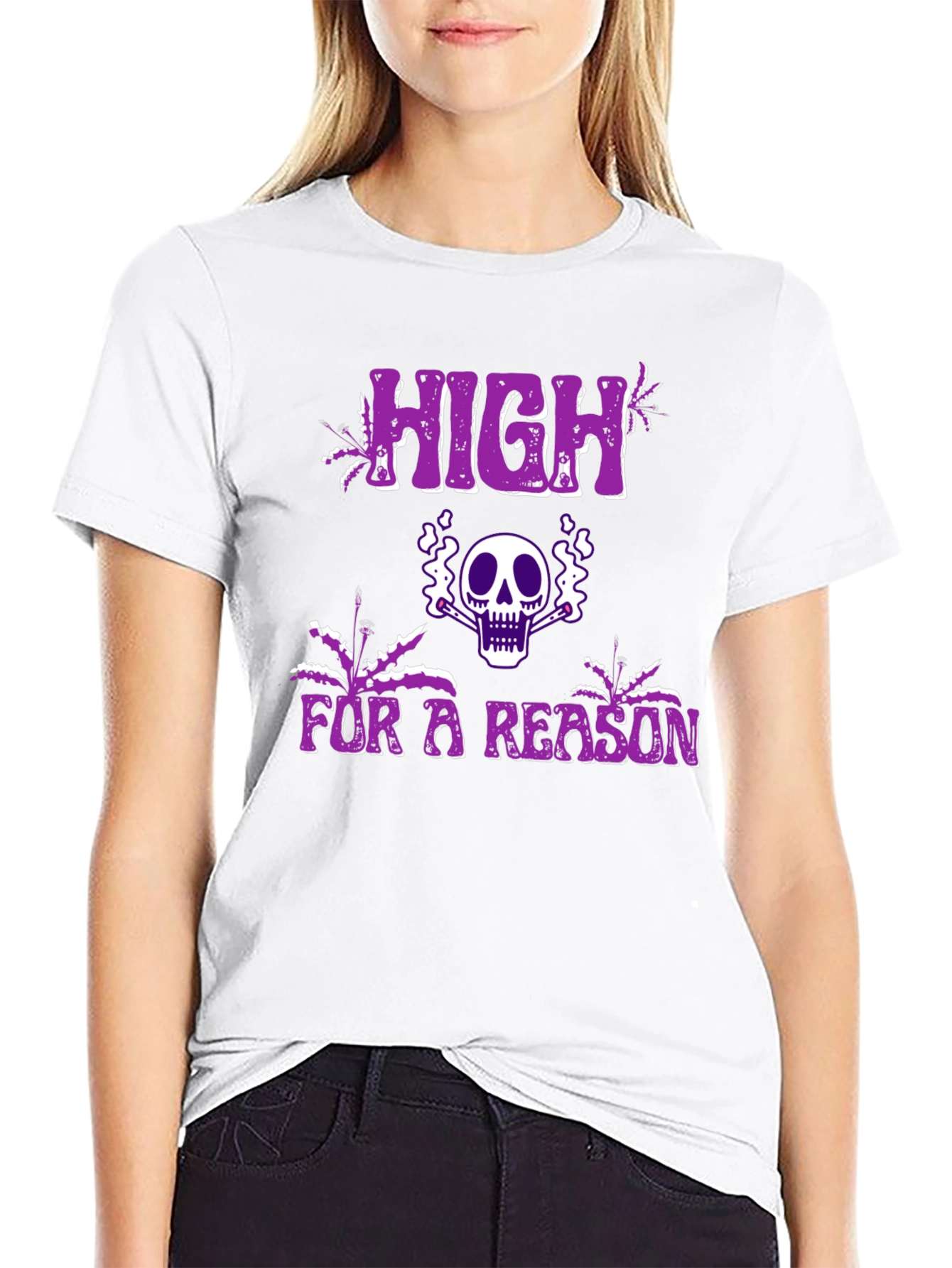 Show off your unique style with this bold black graphic tee! Featuring the phrase "High For A Reason" in a distinctive purple font, this shirt makes a statement. A skull graphic with smoking bones adds an edgy touch to the design. Made from a comfortable, breathable fabric, this tee is perfect for casual wear, concerts, or hanging out with friends. Pair it with jeans or shorts for an effortless look. Embrace your individuality with this eye-catching and comfortable t-shirt.