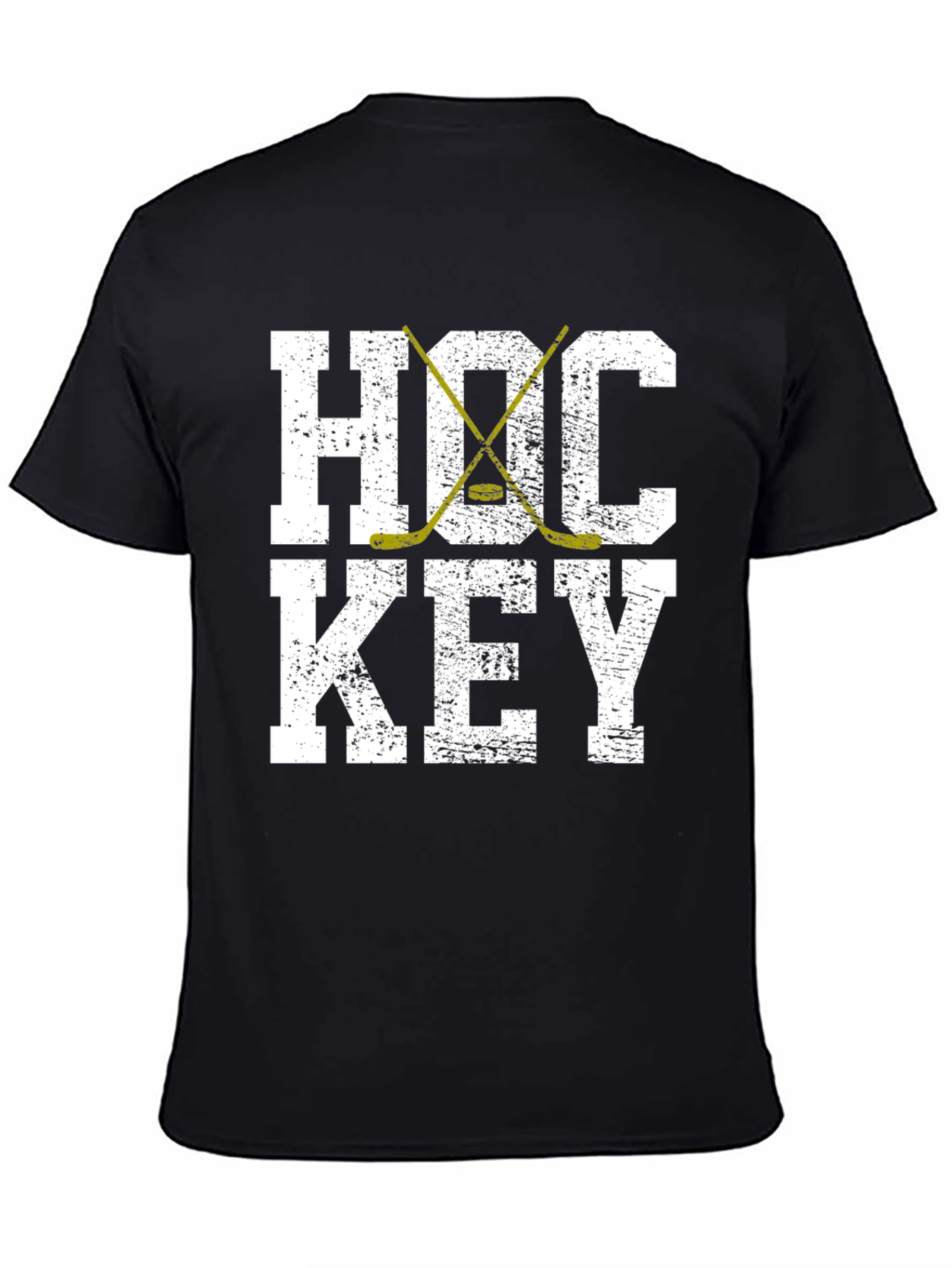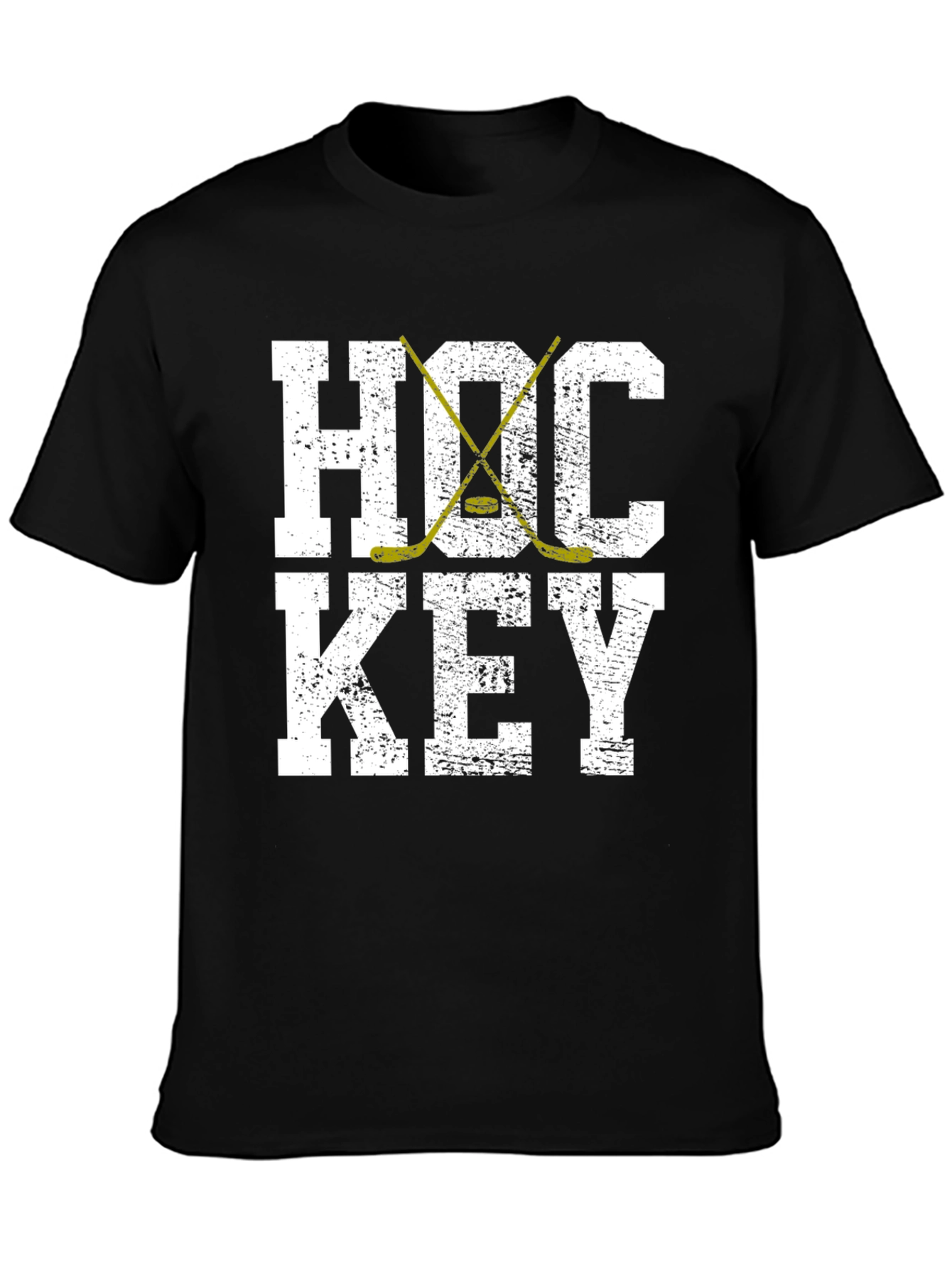 Show your love for hockey with this stylish graphic t-shirt! The design features the word "HOCKEY" in a bold, distressed white font, with crossed hockey sticks completing the graphic. The shirt appears to be made from a comfortable, soft fabric, likely cotton or a cotton blend, and has a classic crew neck and short sleeves. This tee is perfect for wearing to games, practices, or just casually around town. It's a great way to represent your favorite sport with a vintage-inspired look. Add this cool hockey tee to your wardrobe!