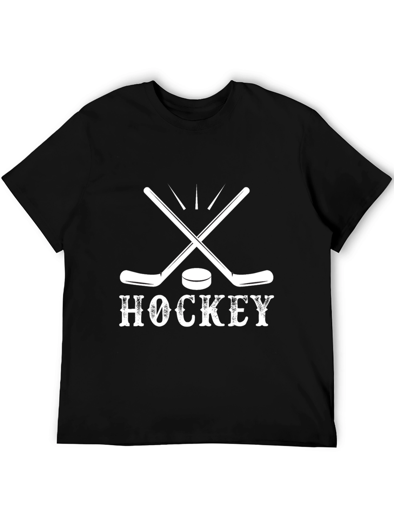 Show your love for hockey with this stylish graphic tee! Featuring a classic black backdrop, the shirt showcases a bold, white design with two crossed hockey sticks and a puck, topped with graphic lines to give it a dynamic feel. The word "HOCKEY" is printed in a rustic font beneath the design. The shirt is made of what appears to be a soft and comfortable fabric, perfect for casual wear or showing team spirit at the rink. Ideal for hockey players, fans, or anyone who appreciates sporty, casual apparel. Pair it with jeans or shorts for a cool, relaxed look.
