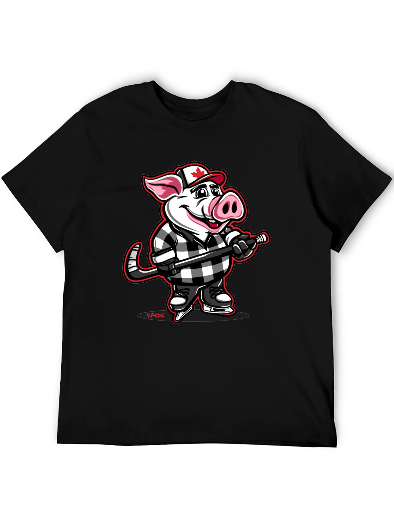 Show off your love for hockey and Canada with this unique black T-shirt! Featuring a cartoon pig wearing a Canadian flag hat, a lumberjack shirt, and hockey skates, this fun design is perfect for any hockey fan with a sense of humor. The pig is holding a hockey stick and is ready to hit the ice. Made from comfortable, breathable material, this shirt is ideal for casual wear, sports events, or just lounging around. Get yours today and let everyone know you're a proud supporter of Canada's favorite sport!