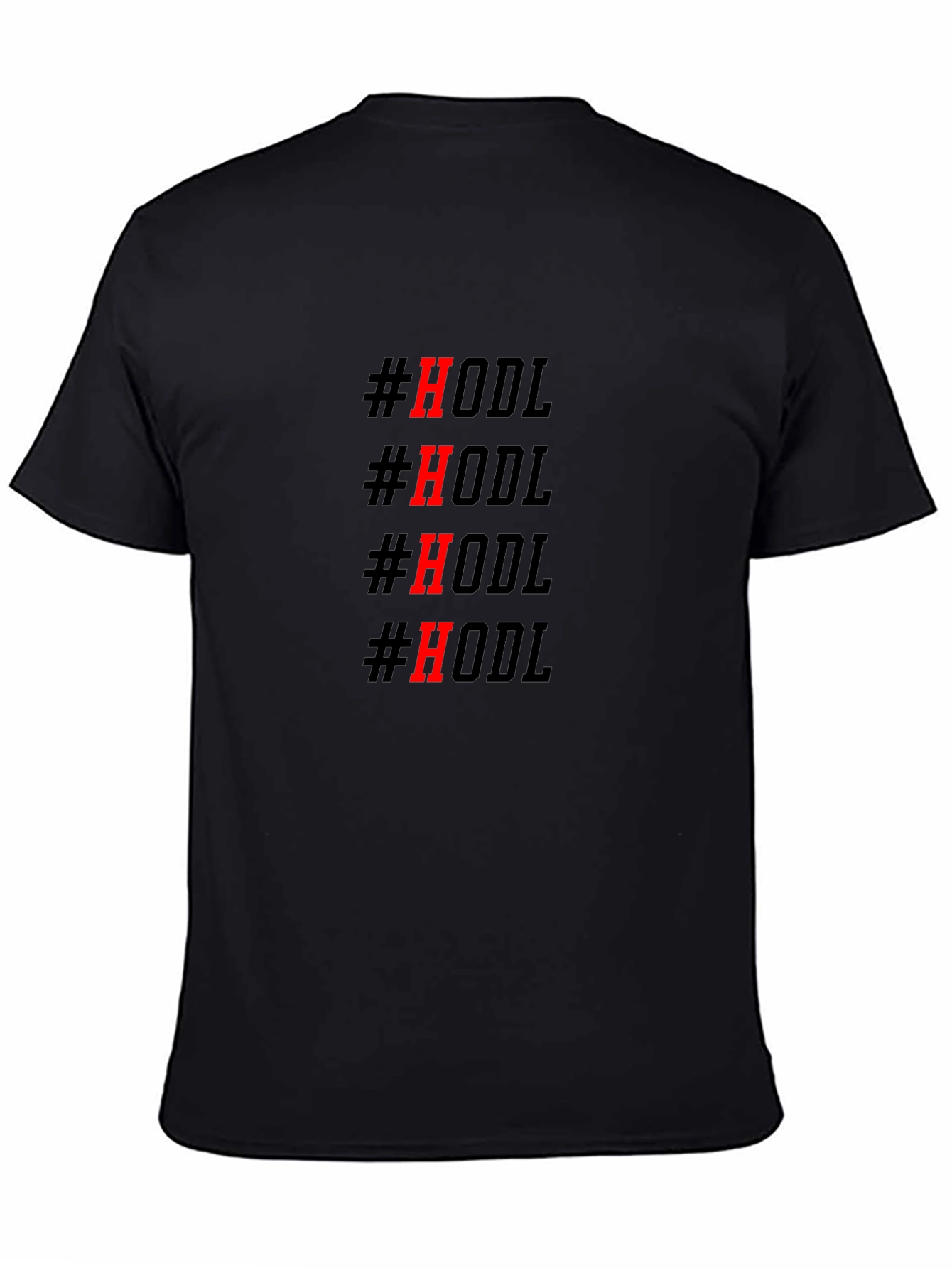 Show your support for cryptocurrency with this stylish black t-shirt. This eye-catching tee features the hashtag '#HODL' repeated in a vertical pattern, with the 'H' in red, making it a bold statement piece for any crypto enthusiast. Made from what appears to be a soft and breathable fabric, it offers both comfort and style. The classic short-sleeve design makes it perfect for casual wear, crypto meetups, or as a conversation starter. Get yours today and let everyone know you're in it for the long haul! A great gift for the crypto investor in your life!