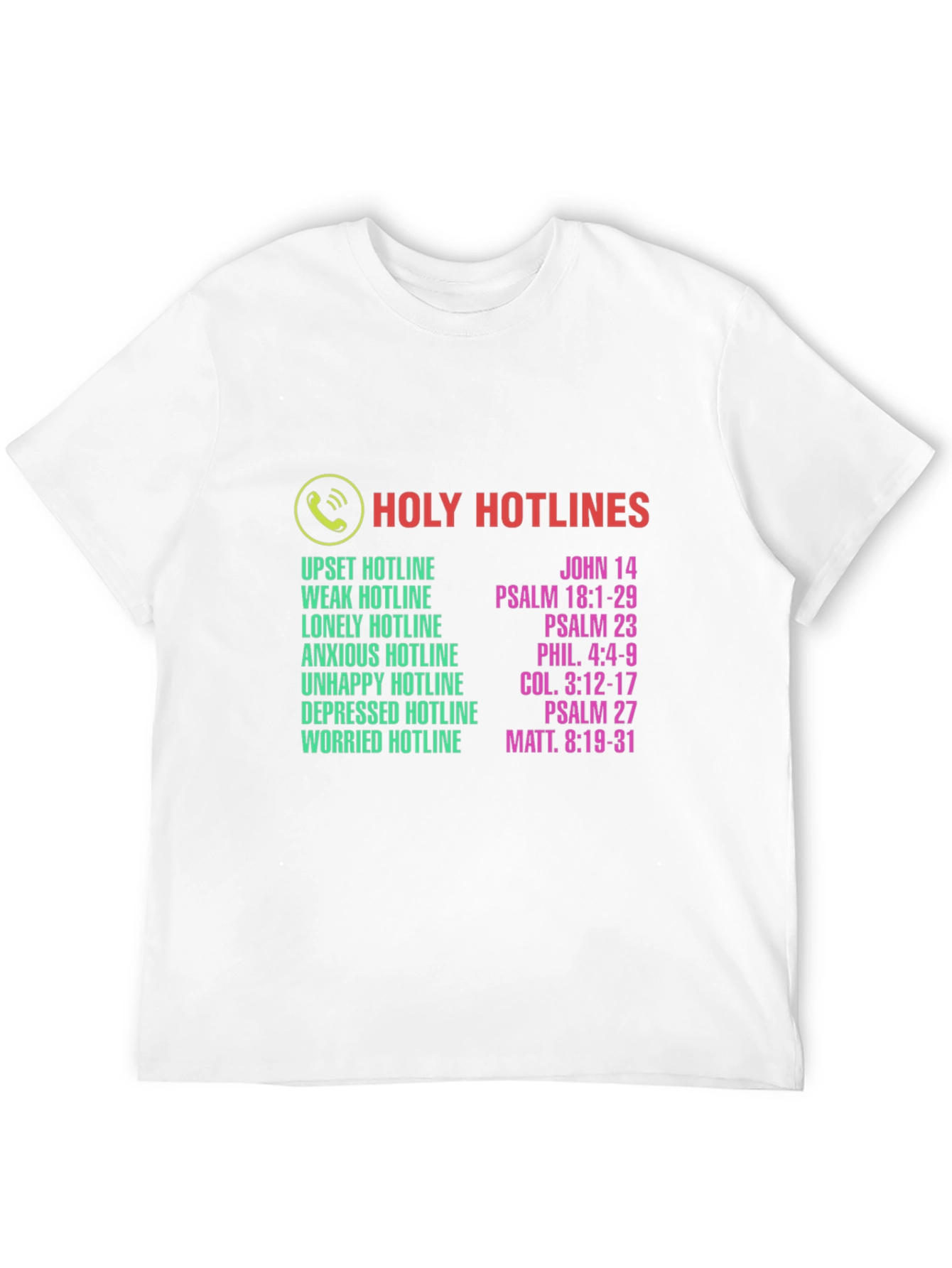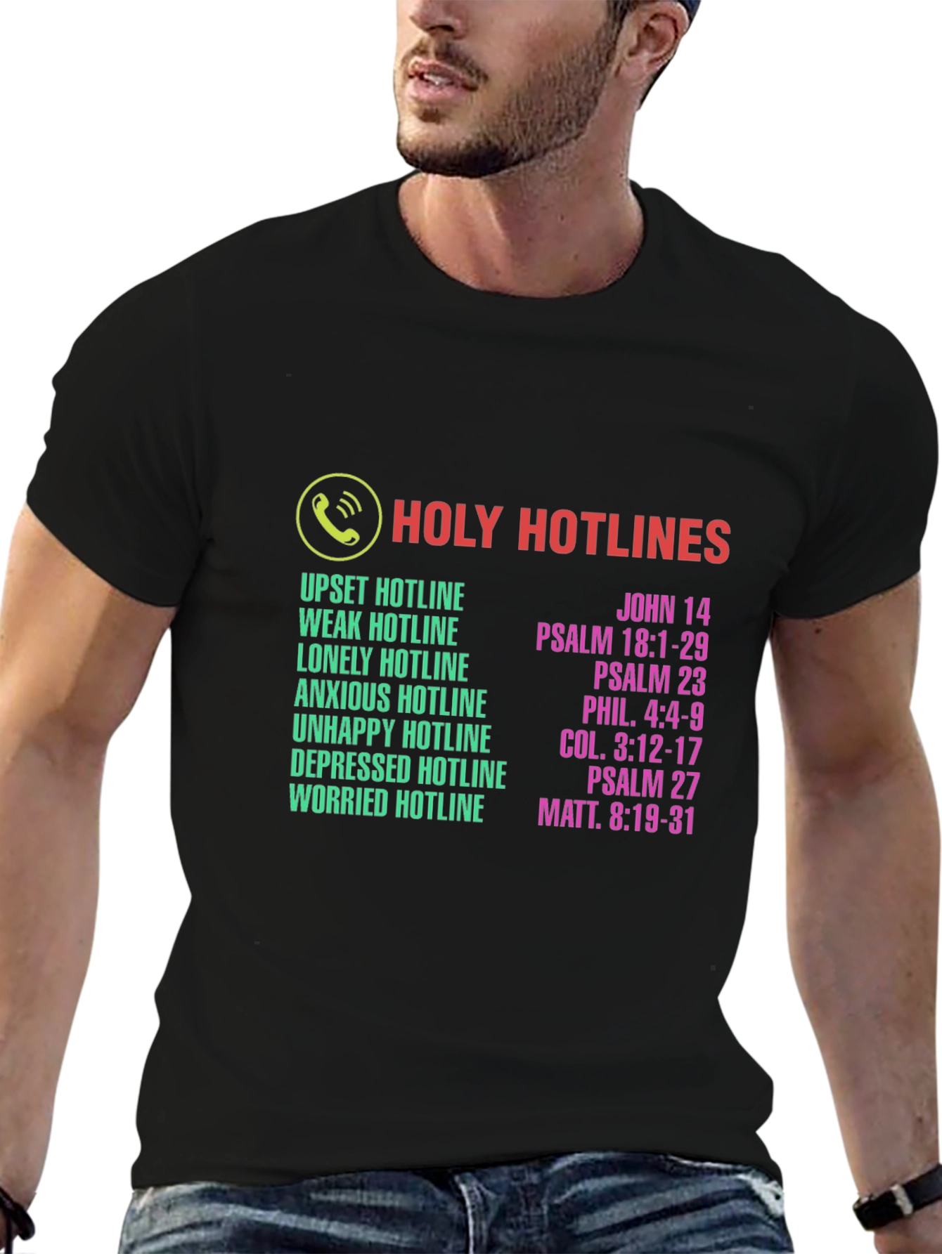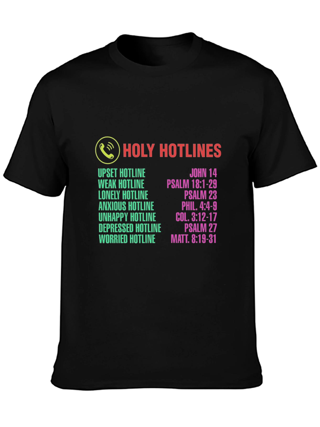 This classic fit black t-shirt features a unique and uplifting design. The shirt has the phrase 'Holy Hotlines' in bold red letters, accompanied by a graphic of a phone. Below are listed various emotional states like 'upset', 'weak', 'lonely', 'anxious', 'unhappy', 'depressed', and 'worried'. Next to each emotional state is a reference to a verse from the Bible, providing spiritual guidance and comfort. Made from a comfortable-looking material, this shirt is perfect for expressing faith and sharing a message of hope. It's ideal for casual wear, church events, or as a thoughtful gift for someone seeking solace and inspiration.