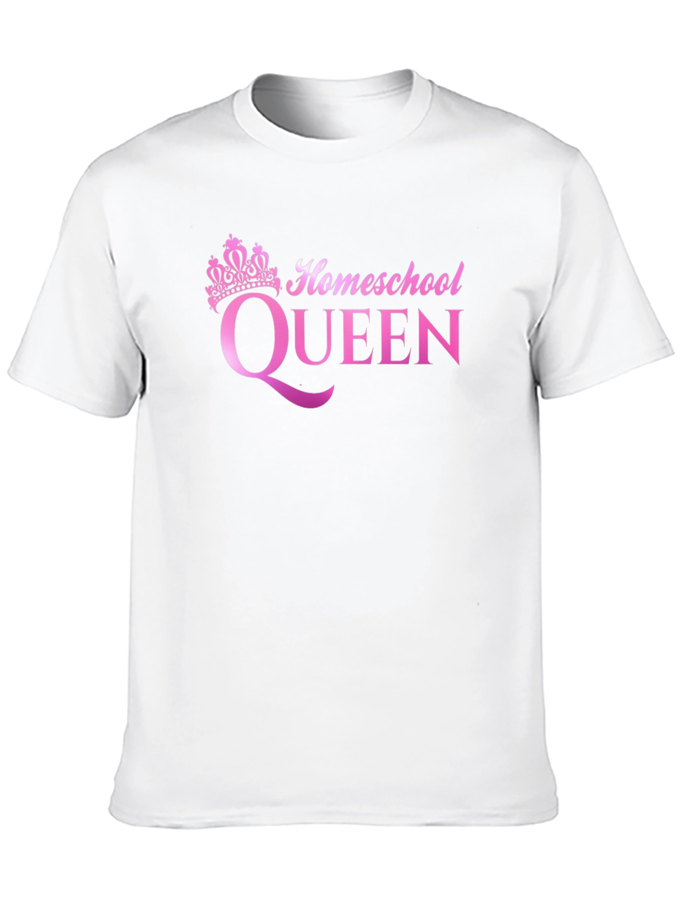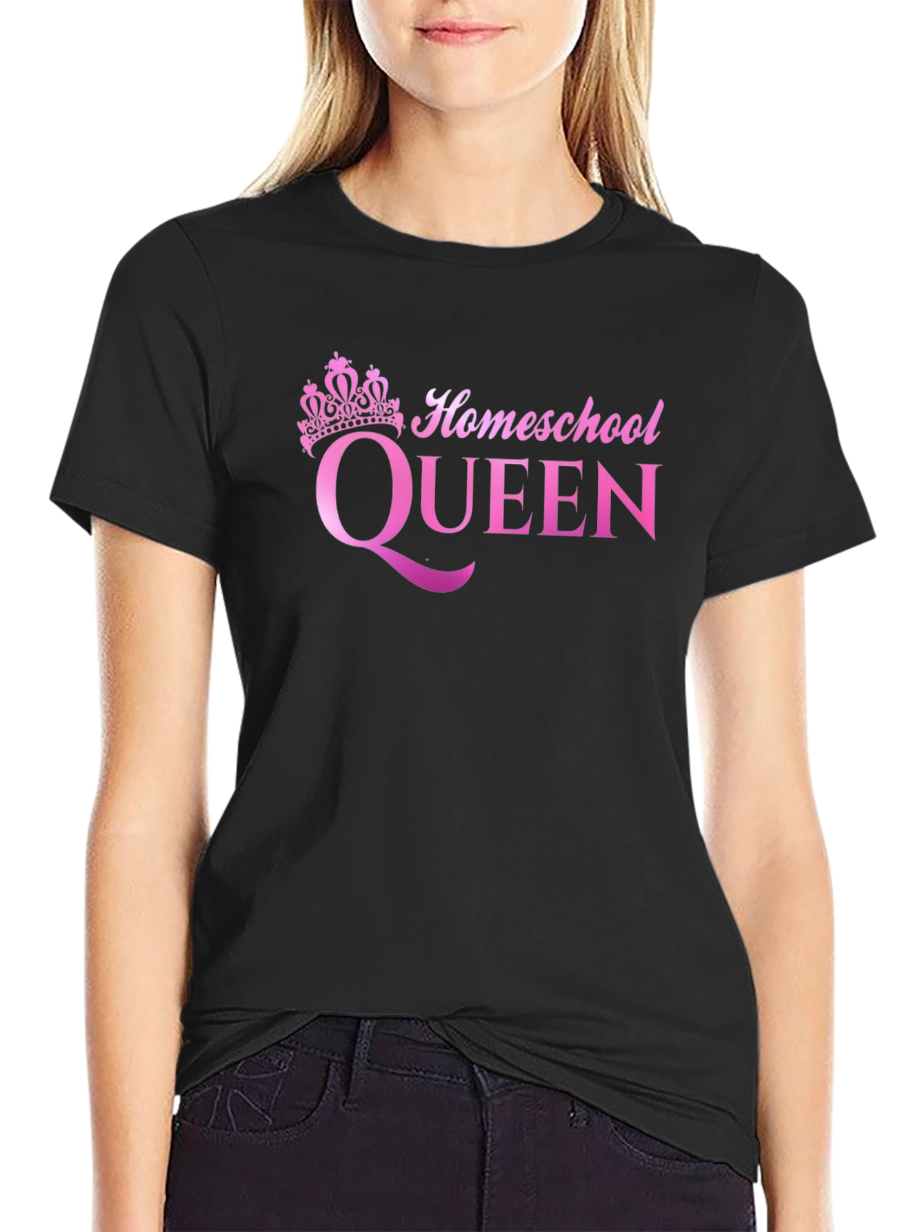 Show off your homeschool pride with this stylish black graphic t-shirt. The design features the phrase "Homeschool Queen" in a vibrant pink gradient font, topped with a decorative crown. Made from a comfortable-looking fabric, this tee is perfect for casual wear, homeschool events, or as a fun gift for any homeschooling mom. This shirt is sure to be a conversation starter and will help you show off your passion for homeschooling. Available in a range of sizes.