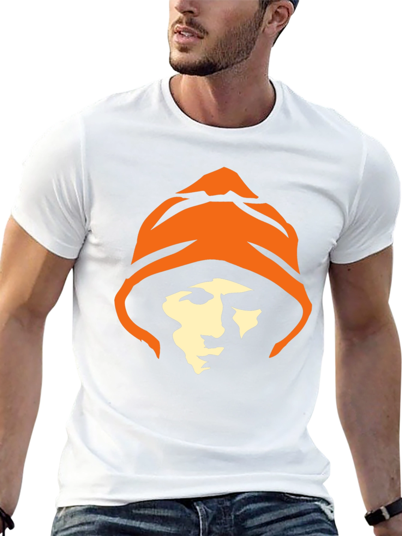 Make a bold statement with this black cotton t-shirt featuring a unique hooded figure graphic. The design showcases a stylized face framed by an orange hood, creating a striking contrast against the dark background. Crafted from soft and breathable cotton, this tee offers all-day comfort and a relaxed fit. Perfect for casual outings, streetwear styles, or expressing your individuality. Pair it with jeans, joggers, or shorts for a versatile look that stands out. This distinctive t-shirt is a must-have for those who appreciate eye-catching designs and comfortable everyday wear.