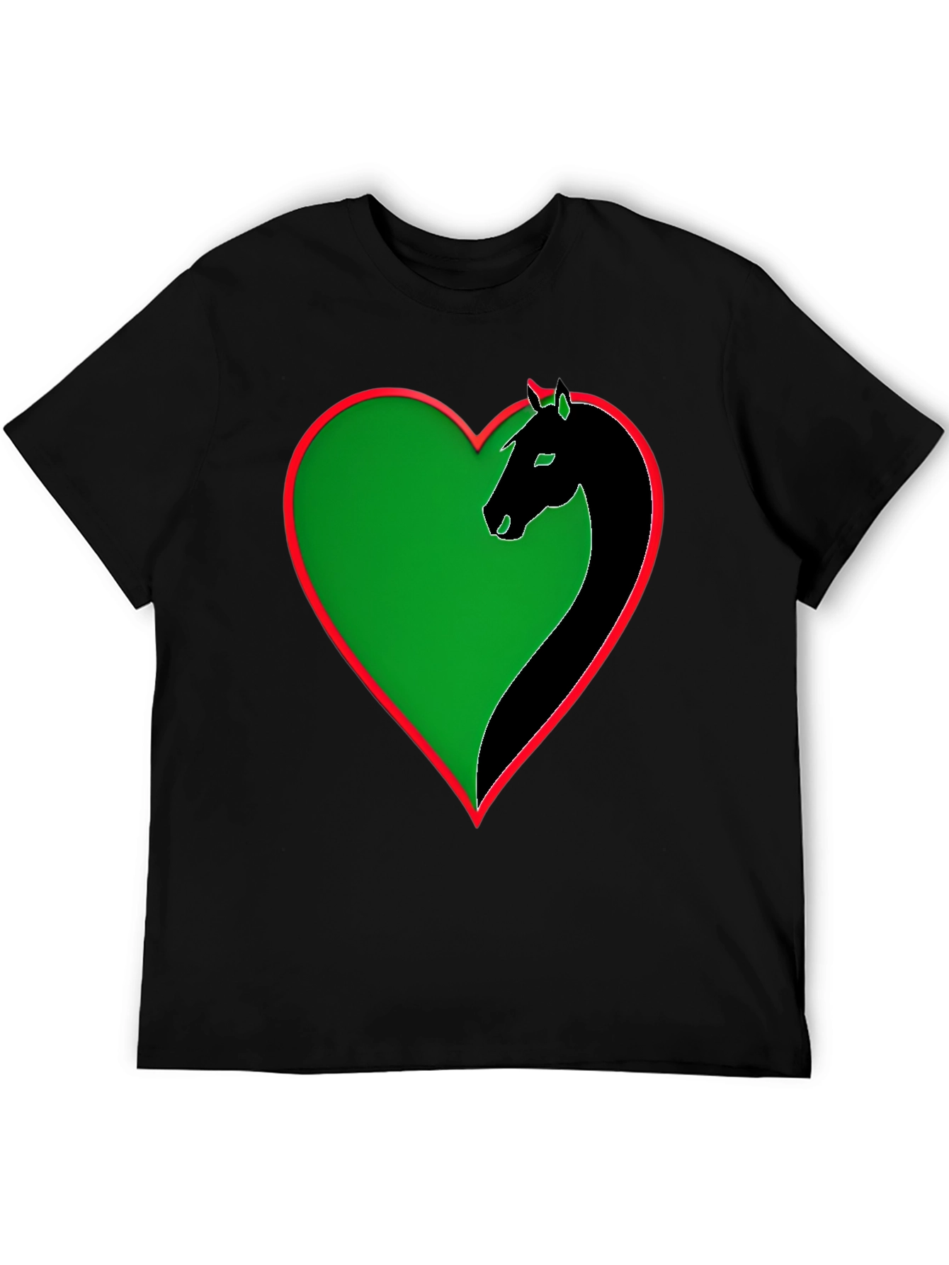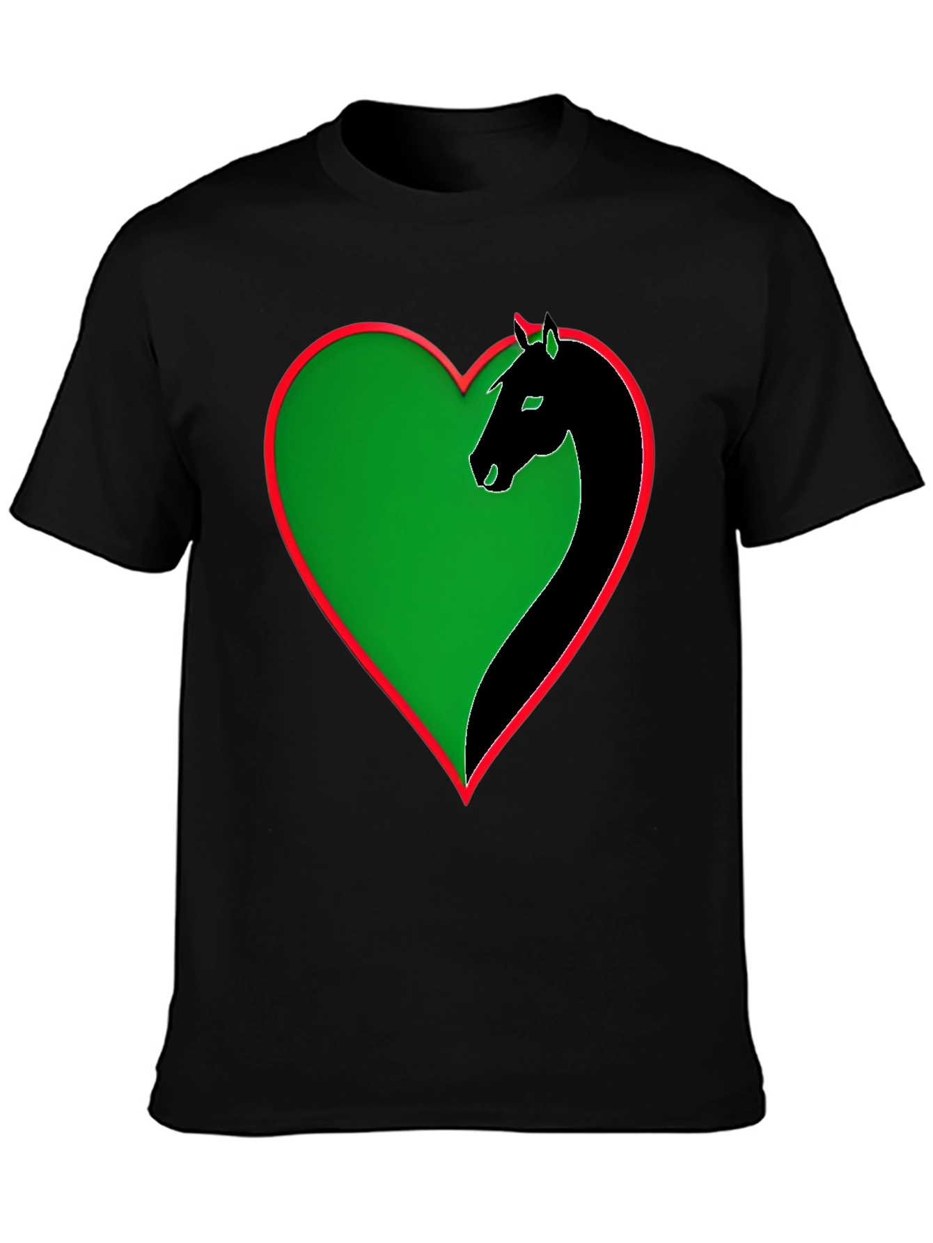Show your love for horses with this eye-catching black t-shirt. It features a unique graphic design of a horse's head and neck, silhouetted in black, set within a vibrant green heart shape outlined in red. The design creates a striking contrast against the shirt's dark background, making it a standout piece. Made from what appears to be a comfortable cotton blend, this short-sleeved tee is perfect for casual wear, horse riding events, or as a fun gift for horse lovers. Add a touch of equine style to your wardrobe today!