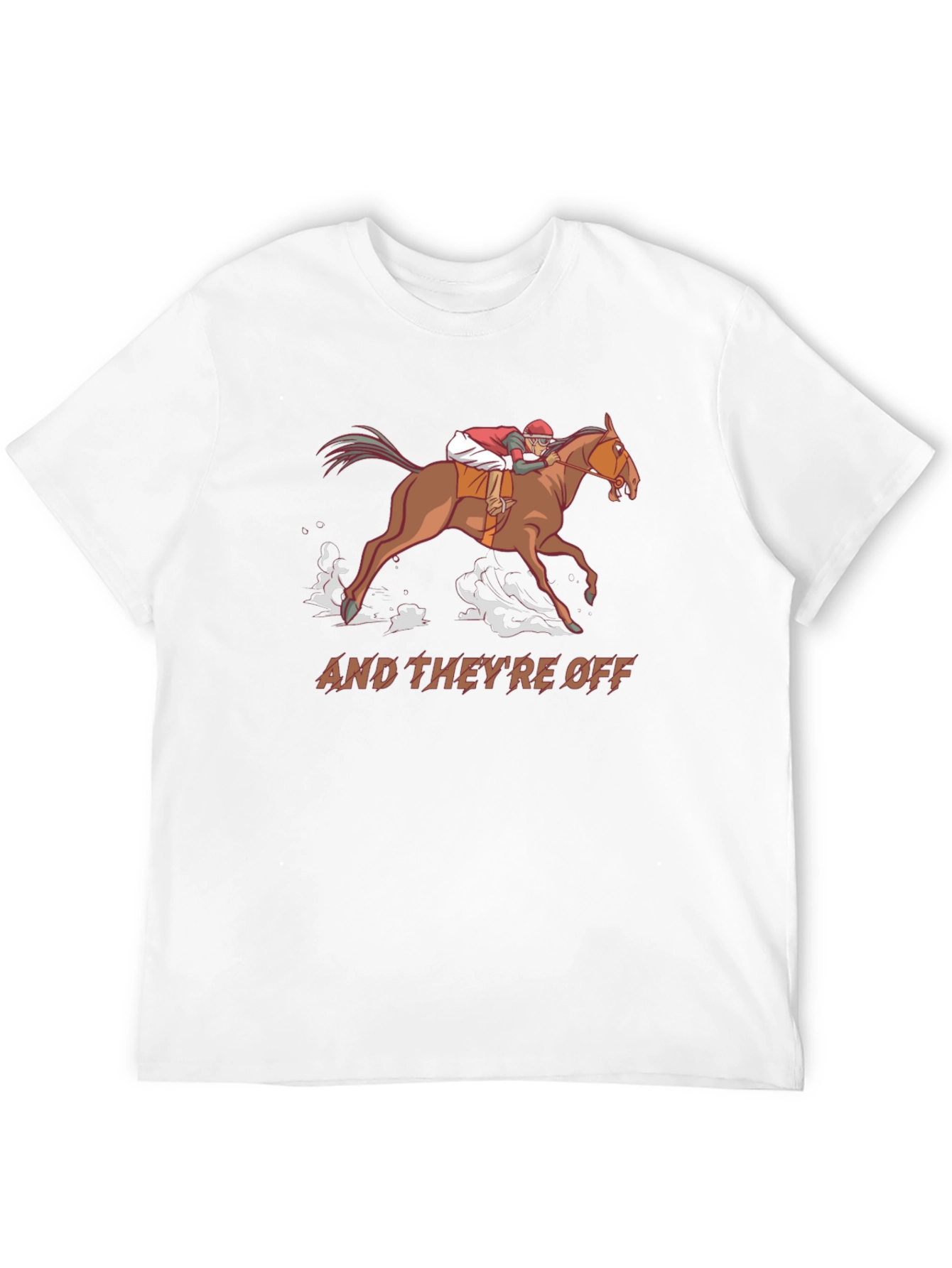 Giddy up and show your love for the races with this unique graphic tee! This black t-shirt features a vibrant illustration of a horse and jockey in full stride, kicking up dust as they sprint towards the finish line. Below the image, the words "AND THEY'RE OFF" are printed in a stylish font, adding to the excitement. This eye-catching design is perfect for horse racing enthusiasts and anyone who appreciates a bold and fun statement piece. Comfortable and casual, this tee is perfect for everyday wear, race day events, or simply showing off your unique style. Add this winning piece to your wardrobe today!