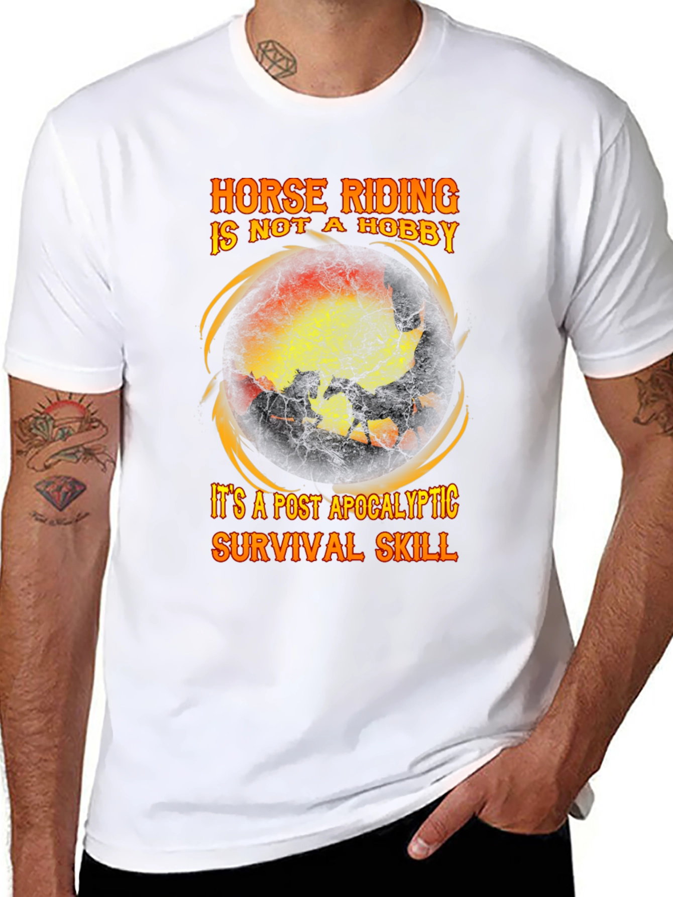 Embrace your passion with this bold black t-shirt featuring the statement "Horse Riding is Not a Hobby. It's a Post Apocalyptic Survival Skill." The design showcases horses silhouetted against a fiery, distressed earth, encapsulated in an energetic, circular border. Made from comfortable fabric, this tee is perfect for equestrians who love a touch of humor and edgy style. Ideal for casual wear, horse shows, or as a gift for horse lovers with a post-apocalyptic sense of humor.