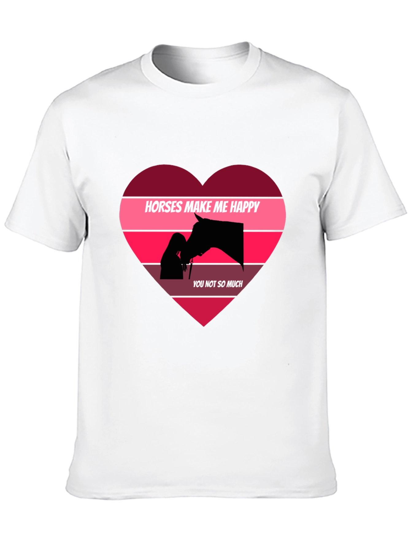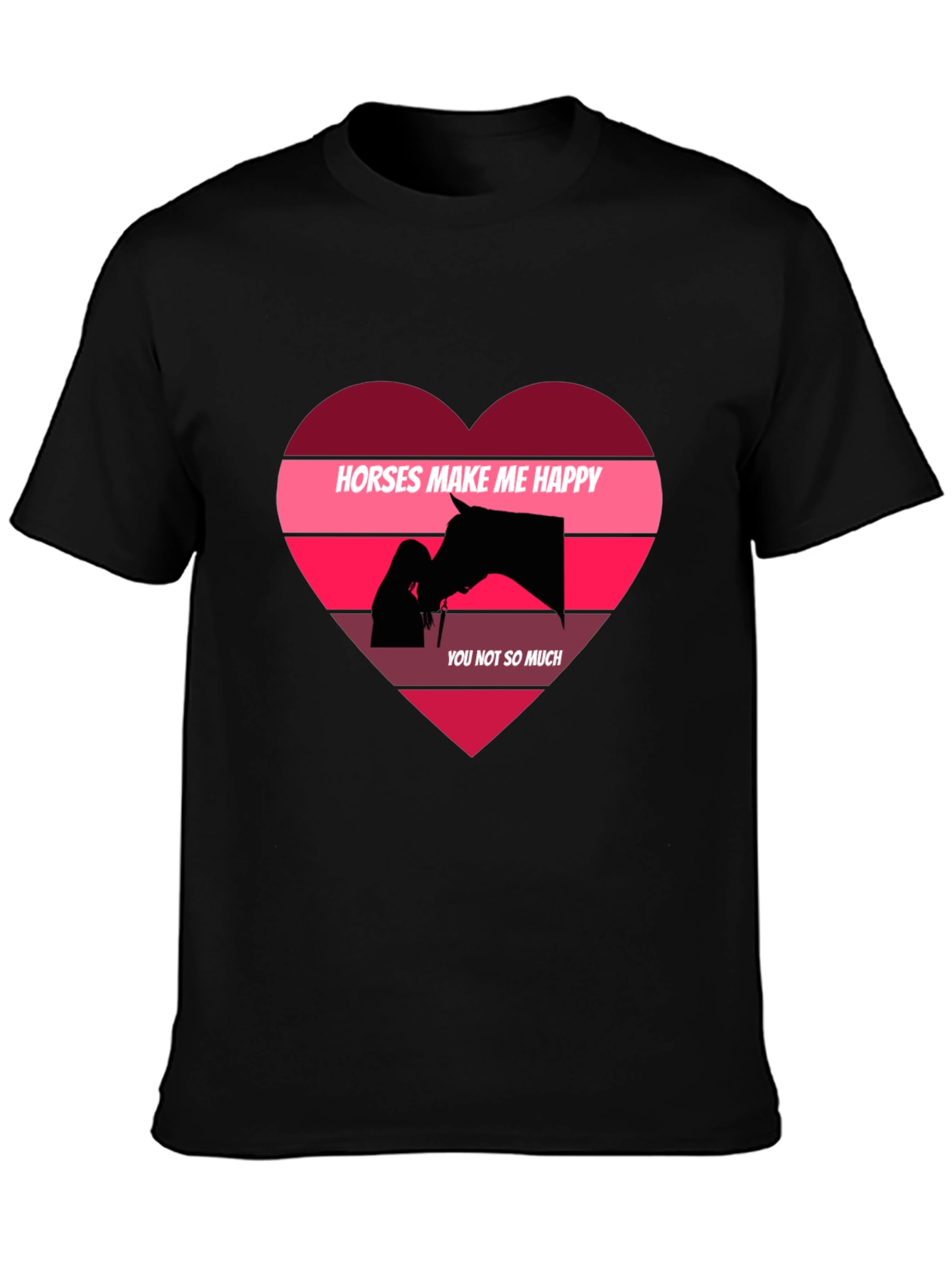 Show your love for horses with this stylish and comfortable graphic t-shirt. This black tee features a unique heart design with the phrase 'Horses Make Me Happy, You Not So Much' along with a silhouette of a woman and a horse. The heart is designed in shades of pink and burgundy, creating a striking visual contrast against the black background. Made from soft, breathable fabric, this t-shirt is perfect for everyday wear. Whether you're heading to the barn or just running errands, this tee is sure to make a statement. A great gift for any horse lover!