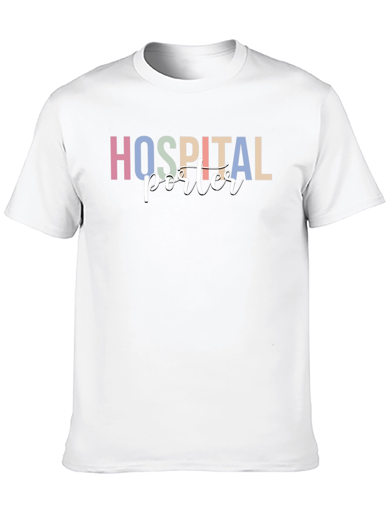 This stylish black t-shirt features a unique graphic design that proudly displays the words "Hospital Porter" in a trendy, multi-colored font. The word "Hospital" is shown with soft pastel tones, with "porter" in a cursive white underneath. Made from what appears to be a soft and breathable fabric, this t-shirt offers both comfort and style. Its classic crew neck and short sleeves make it a versatile addition to any wardrobe. Perfect for hospital staff or anyone who appreciates eye-catching designs, this shirt is ideal for casual wear, work, or showing your support for healthcare professionals. Wear it with pride and showcase your commitment to the important role of a Hospital Porter.