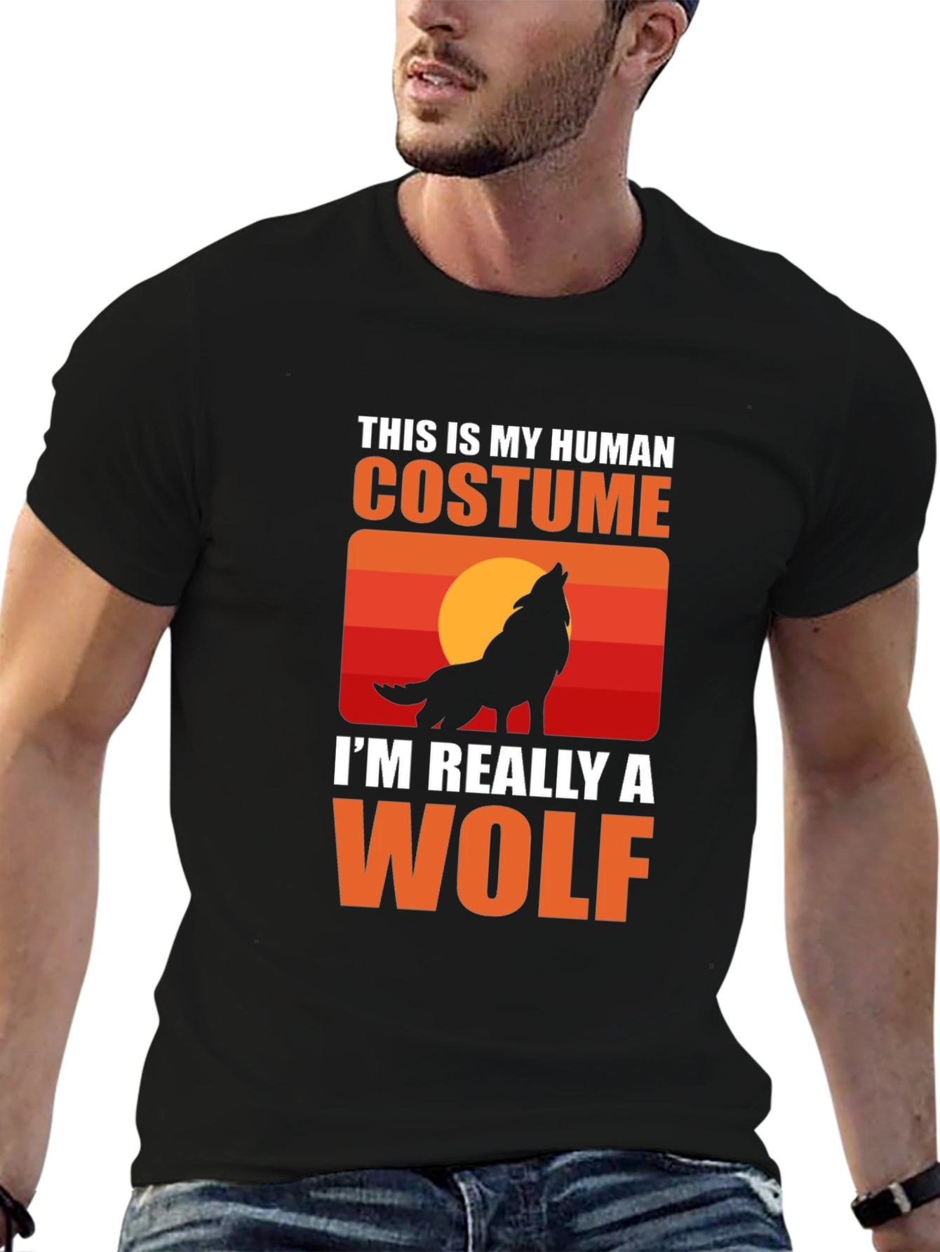 Embrace your inner wild side with this unique t-shirt. Featuring a bold graphic of a howling wolf silhouette against a retro sunset, this shirt playfully declares 'This is my human costume, I'm really a wolf.' Crafted from a comfortable, breathable fabric, this black tee is perfect for casual wear, Halloween parties, or expressing your love for wolves. The eye-catching design, printed in vibrant orange and white, is sure to turn heads and spark conversations. Show off your fun personality and untamed spirit with this must-have t-shirt. Great for everyday wear or as a unique gift!