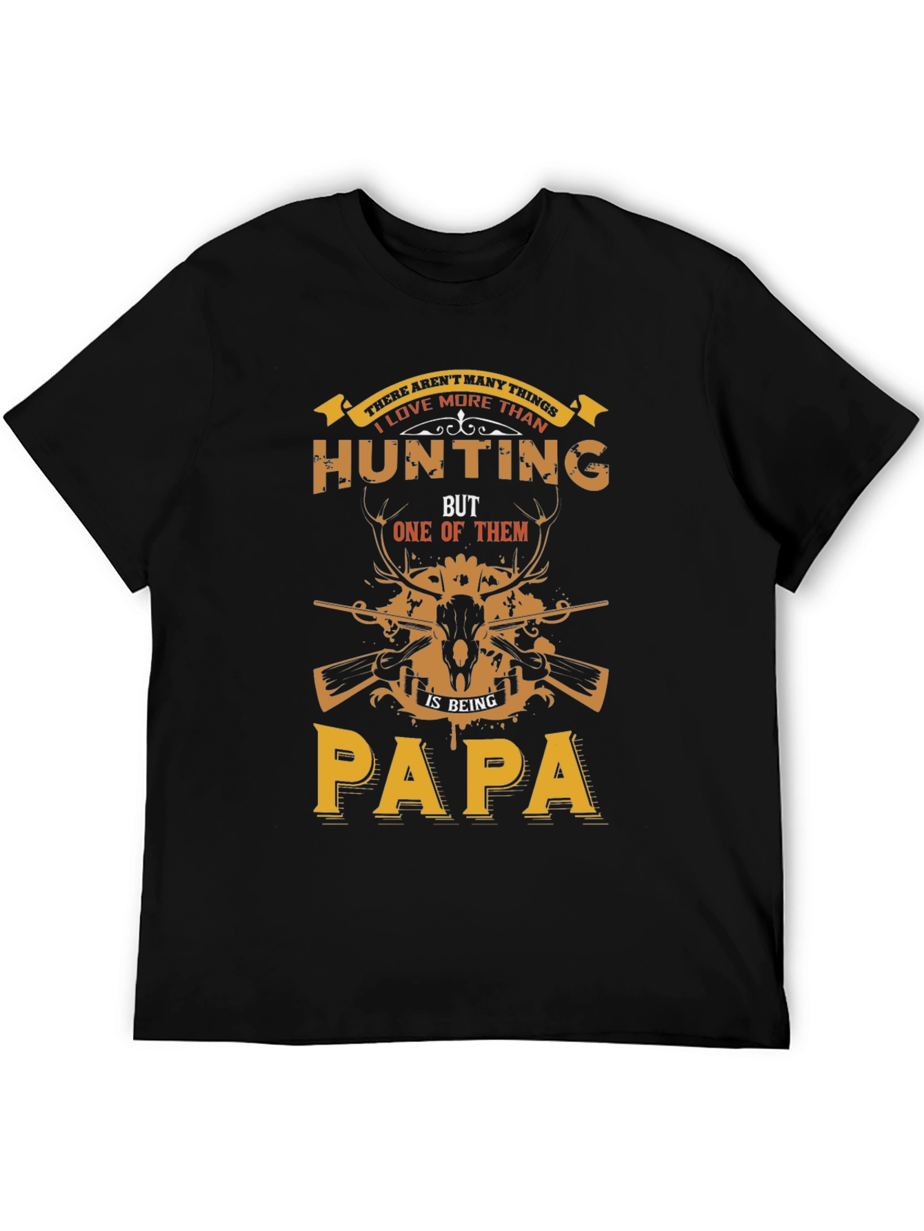 Show your love for hunting and being a papa with this stylish black t-shirt. The design features a bold graphic with a deer skull, crossed rifles, and the phrase 'There aren't many things I love more than HUNTING but one of them is being PAPA.' Made from comfortable and durable fabric, this tee is perfect for casual wear, hunting trips, or as a thoughtful gift for Father's Day. This unique t-shirt is sure to be a hit with any hunting enthusiast who is also a proud dad or grandpa.