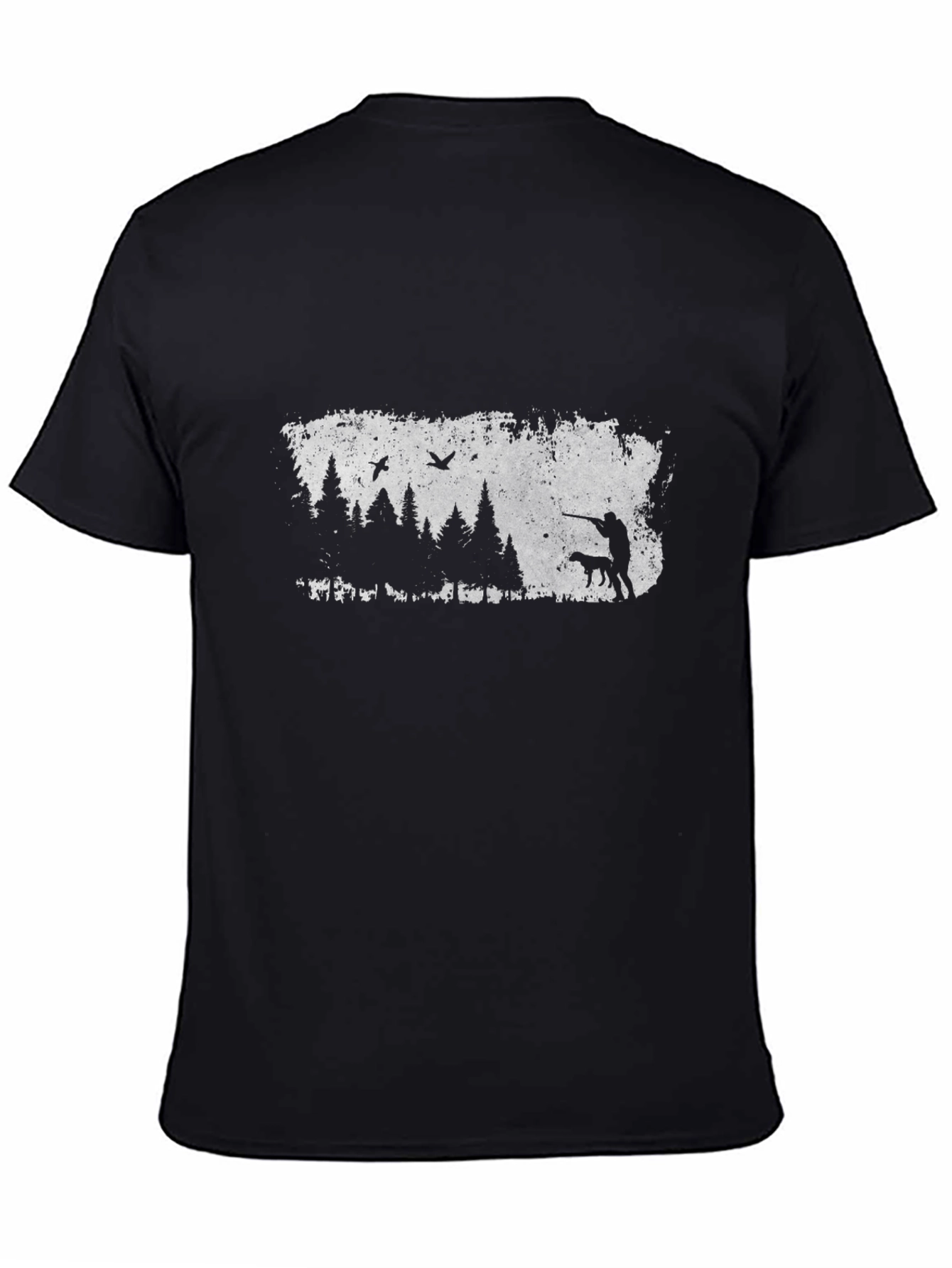 Embrace the outdoors with this striking black men's t-shirt featuring a unique hunting scene graphic. The design showcases a hunter with his dog amidst a forest of trees, with birds flying overhead, all rendered in a distressed, vintage-inspired white print. The tee has a classic crew neck and short sleeves, making it a comfortable and versatile piece for everyday wear. The shirt is likely made from a soft and breathable cotton blend fabric. This tee is perfect for nature enthusiasts, hunters, or anyone who appreciates rustic style. Pair it with jeans or shorts for a casual, cool look. Makes a great gift for the outdoorsman in your life.