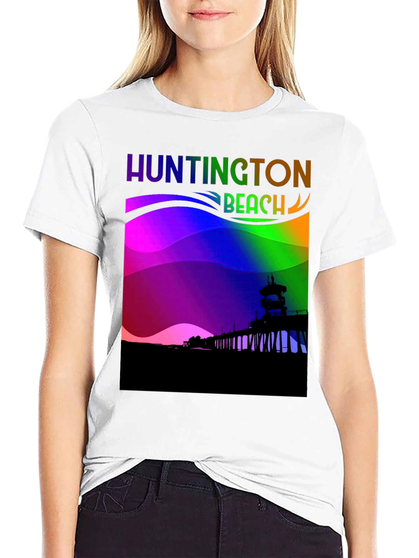 Show off your love for Huntington Beach with this eye-catching black t-shirt. The vibrant, rainbow-colored design features the iconic Huntington Beach pier silhouetted against a stunning gradient background. The words "Huntington Beach" are boldly displayed at the top. Made from comfortable fabric, this tee is perfect for casual wear, beach days, or as a souvenir from your trip. It's a stylish way to represent your favorite California destination!