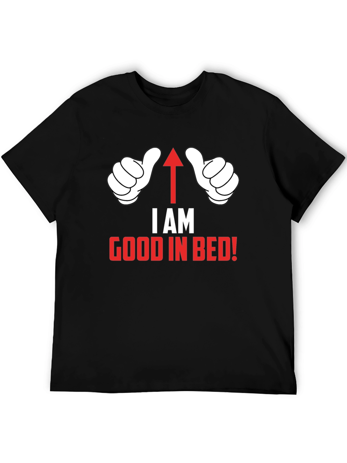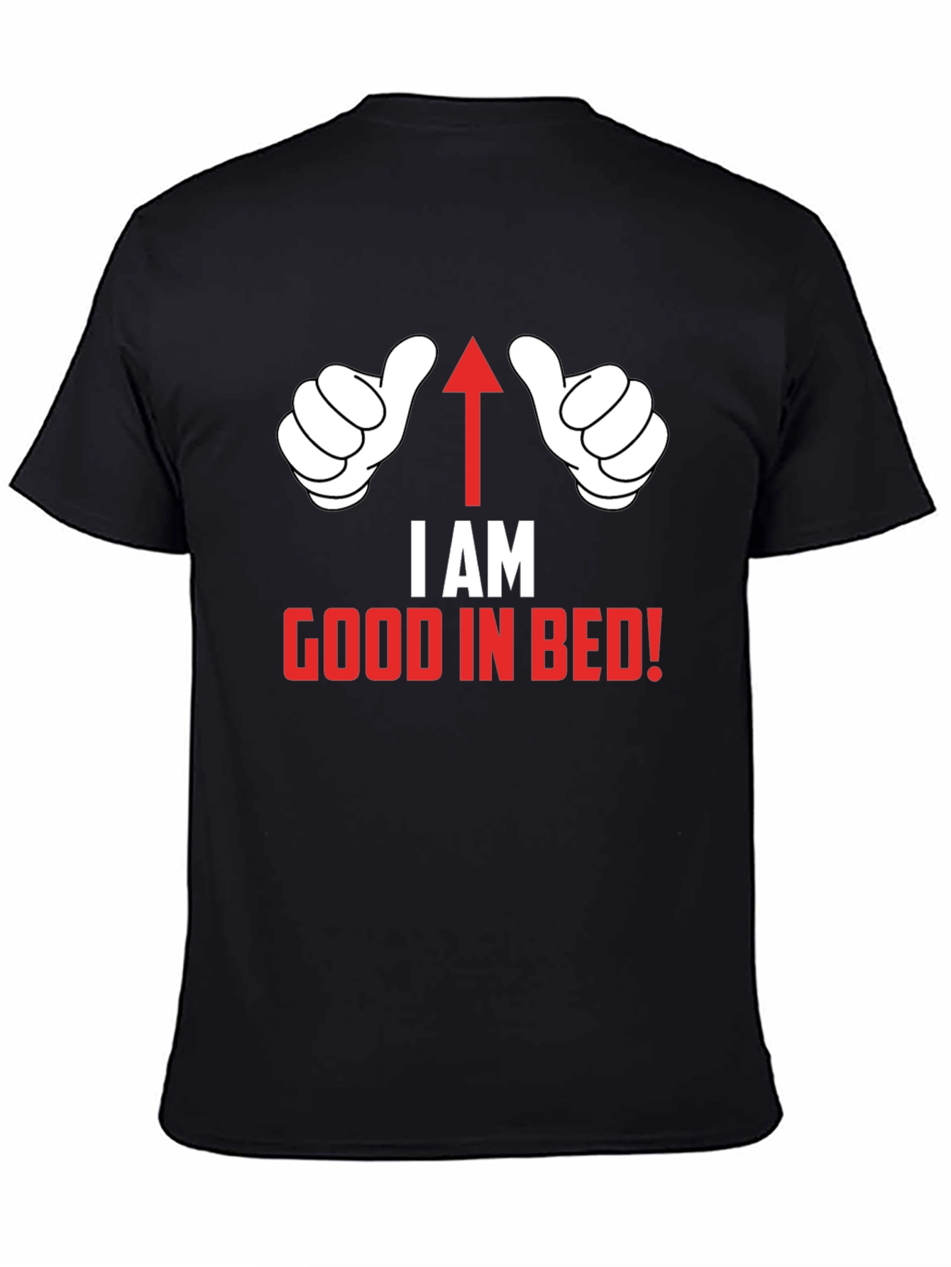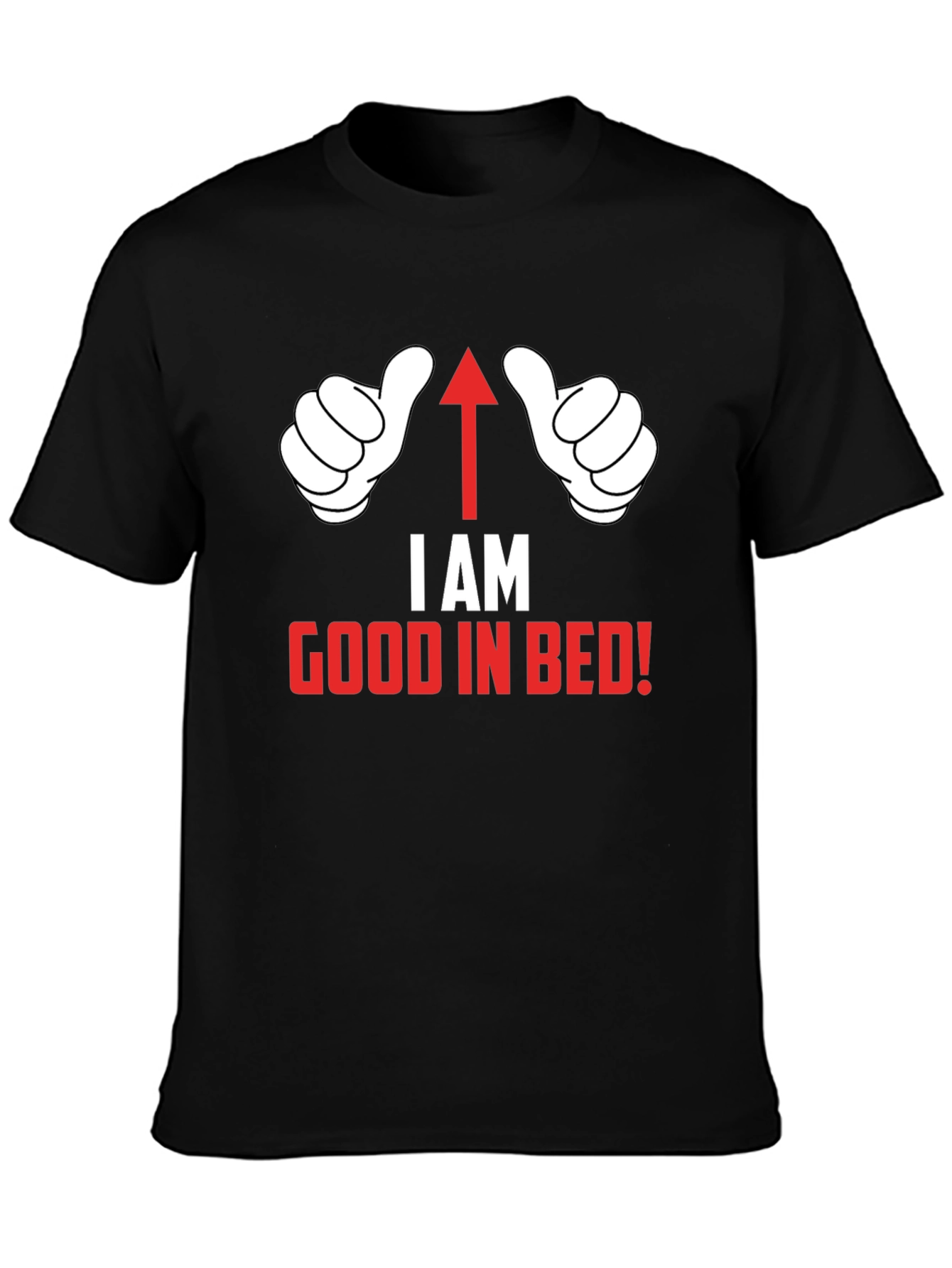 This cheeky black t-shirt features a bold and humorous graphic. Two cartoon-style hands giving thumbs up flank a red upward pointing arrow. Below this image is the text "I AM GOOD IN BED!" in white and red respectively. The shirt appears to be made from a comfortable, breathable fabric. It’s a fun, eye-catching design that's perfect for casual wear, parties, or as a gag gift for a friend. This t-shirt is sure to get some laughs and start conversations. Show off your playful side with this novelty tee! Get yours today!