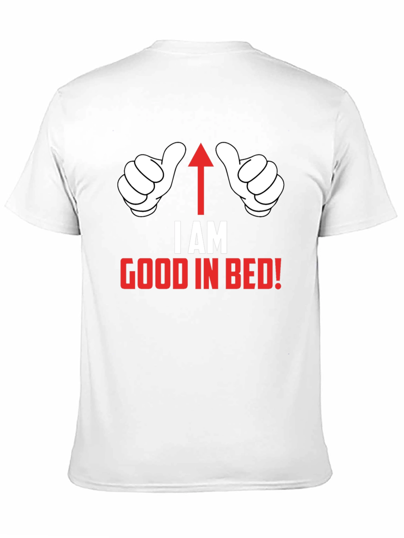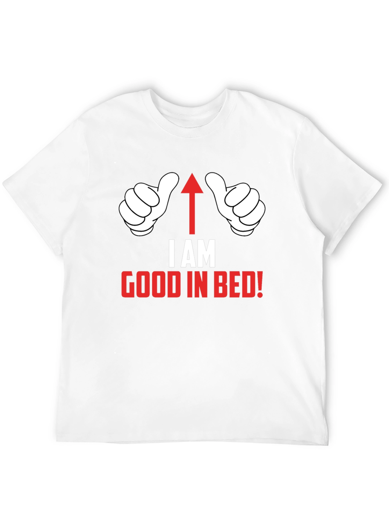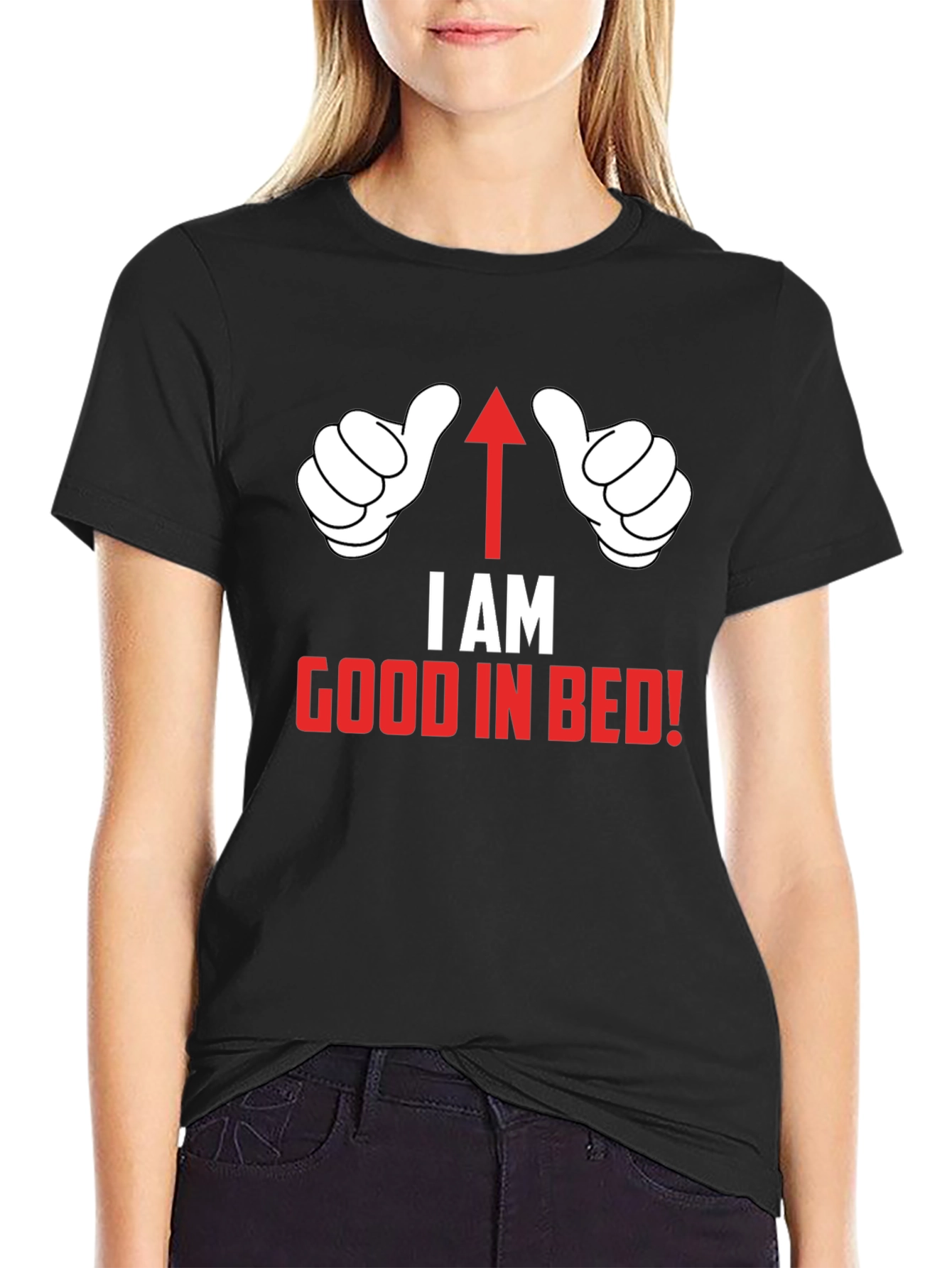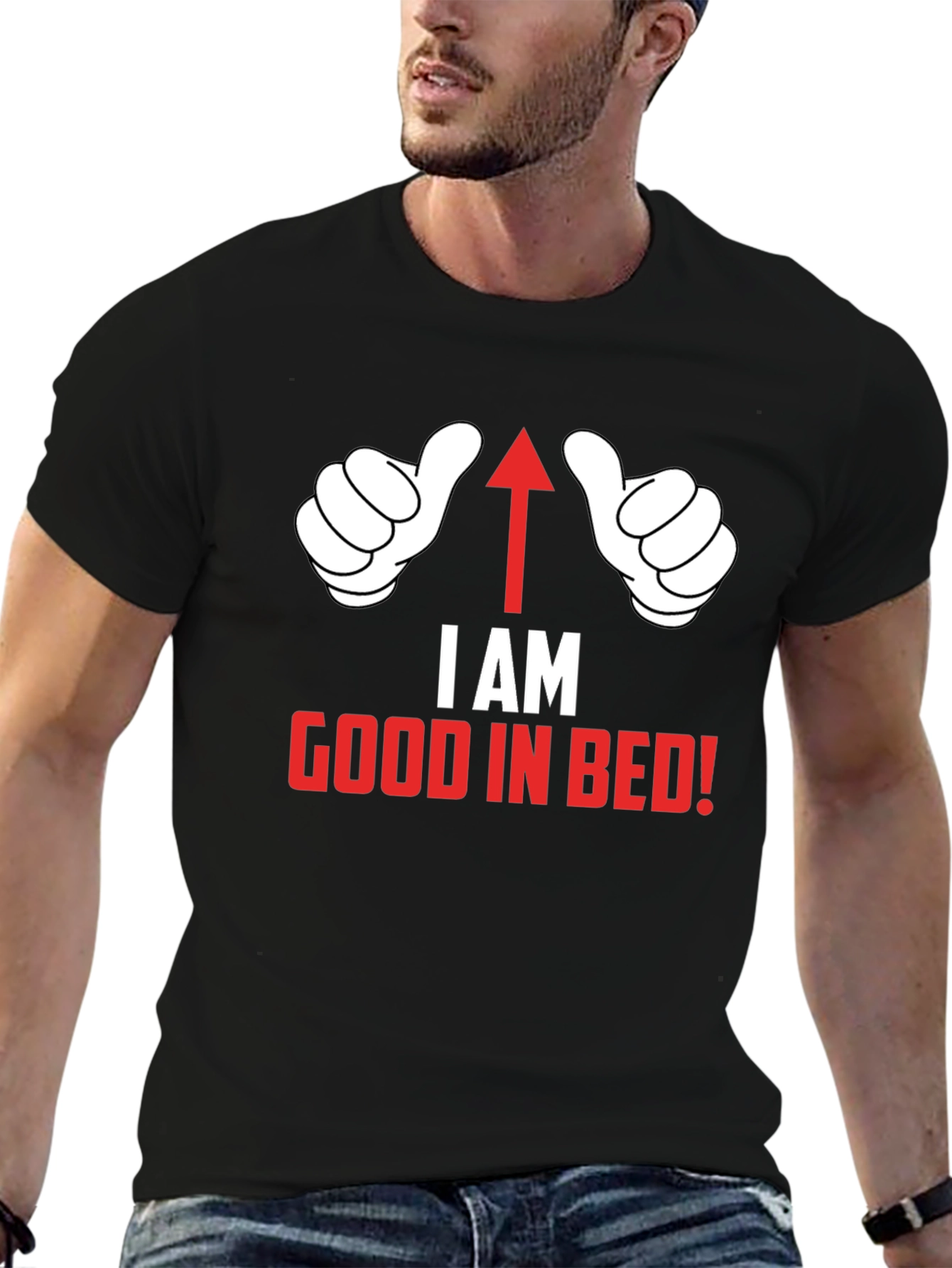 This cheeky black t-shirt features a bold and humorous graphic. Two cartoon-style hands giving thumbs up flank a red upward pointing arrow. Below this image is the text "I AM GOOD IN BED!" in white and red respectively. The shirt appears to be made from a comfortable, breathable fabric. It’s a fun, eye-catching design that's perfect for casual wear, parties, or as a gag gift for a friend. This t-shirt is sure to get some laughs and start conversations. Show off your playful side with this novelty tee! Get yours today!