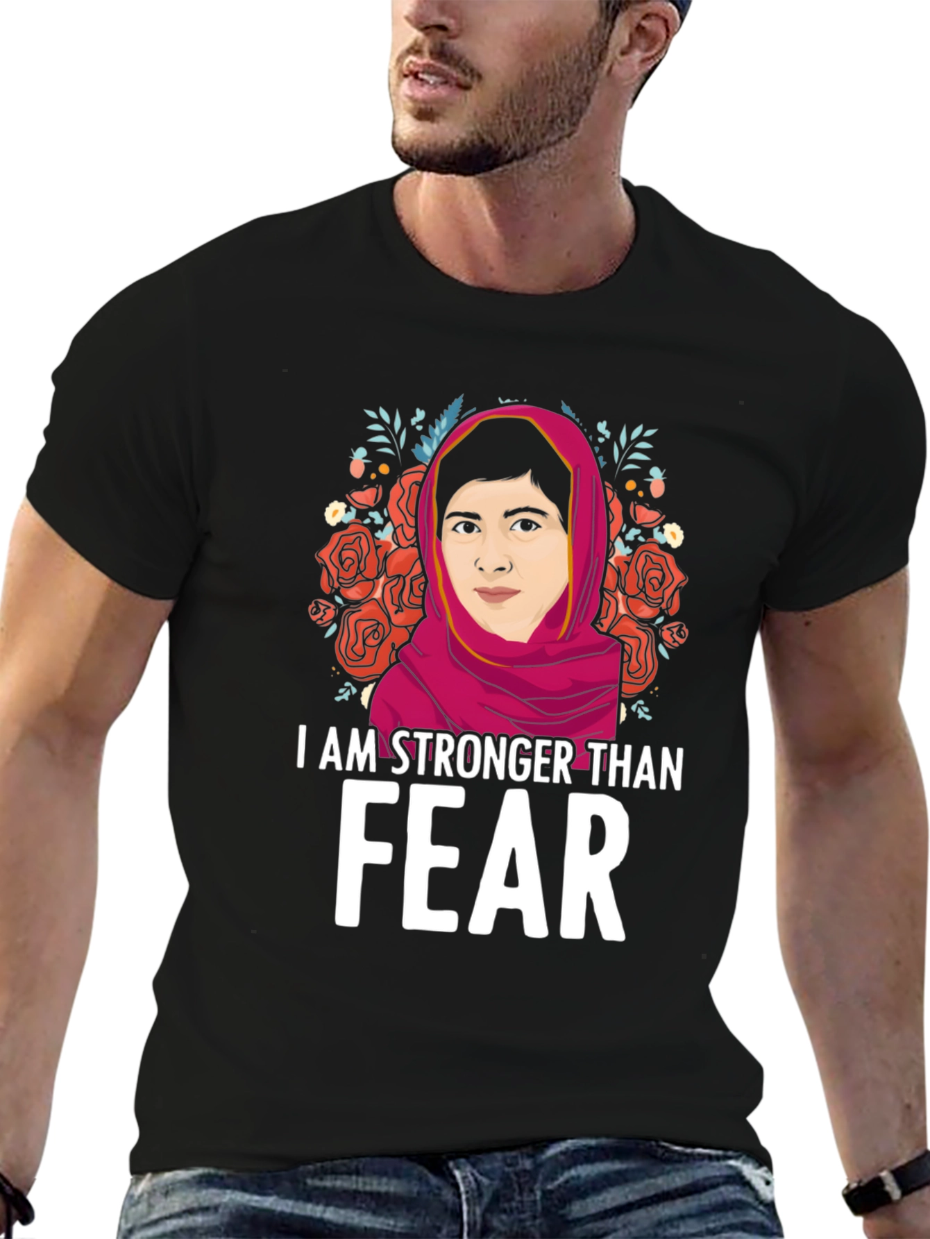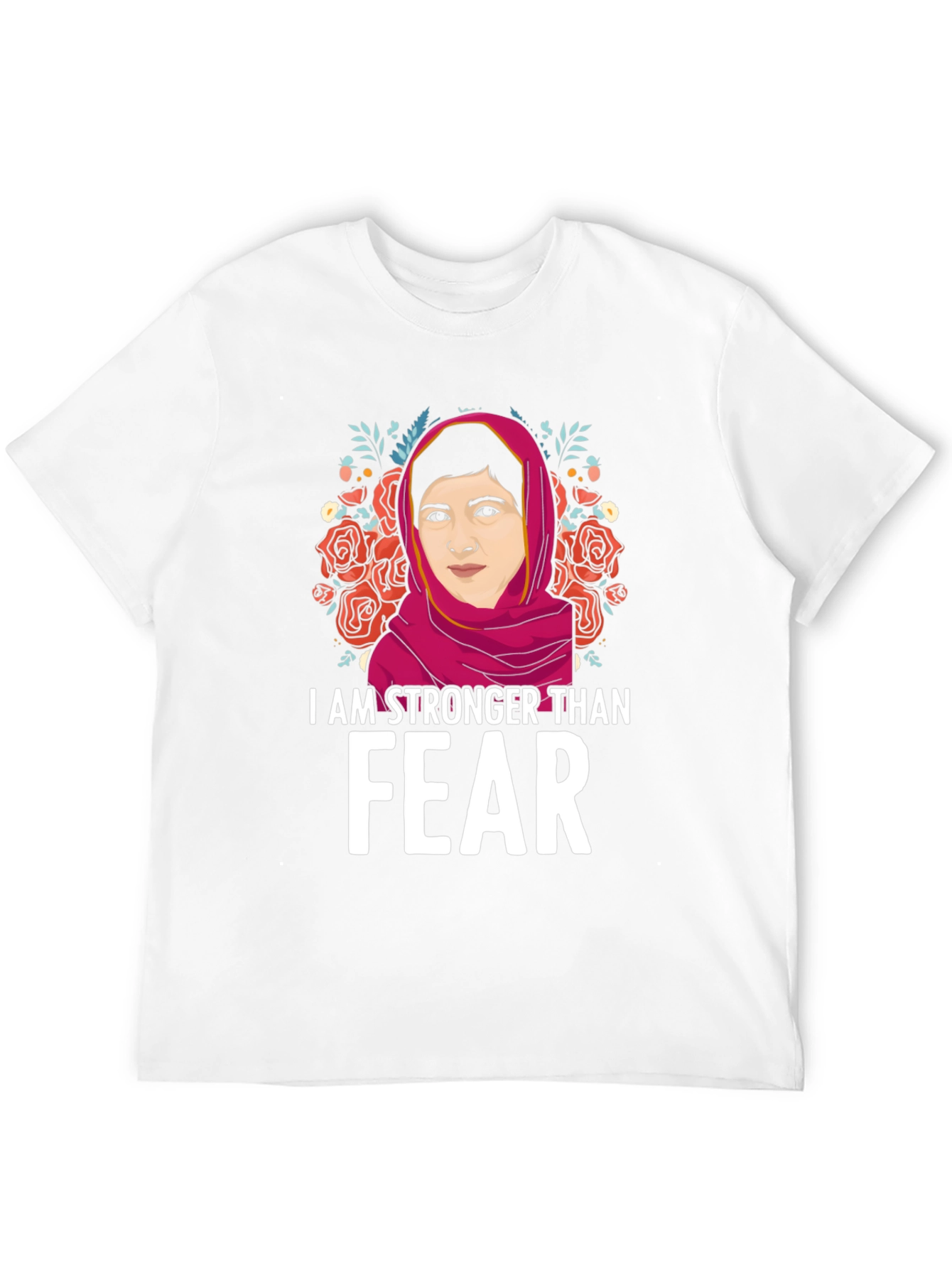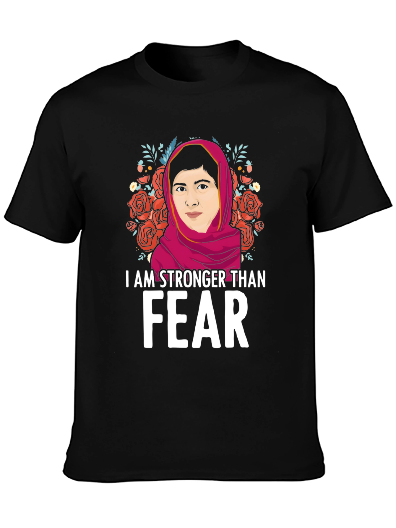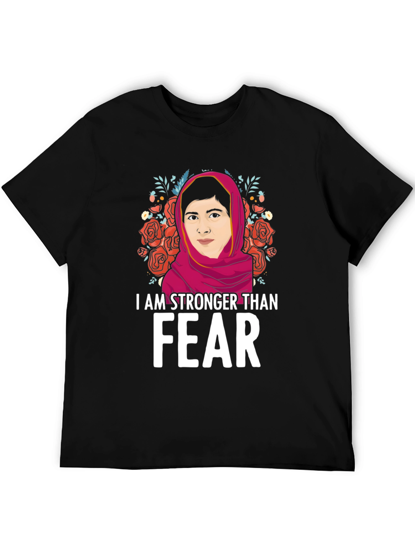 Show your strength and courage with this empowering graphic t-shirt! This black tee features a vibrant illustration of a strong woman framed by beautiful roses and foliage. The bold statement "I AM STRONGER THAN FEAR" is printed in white, making a powerful impact. This comfortable and stylish shirt is perfect for everyday wear, rallies, or as a gift for someone who inspires you. Made from soft, breathable fabric, this tee is sure to become a favorite. Let your clothing speak volumes with this meaningful piece!