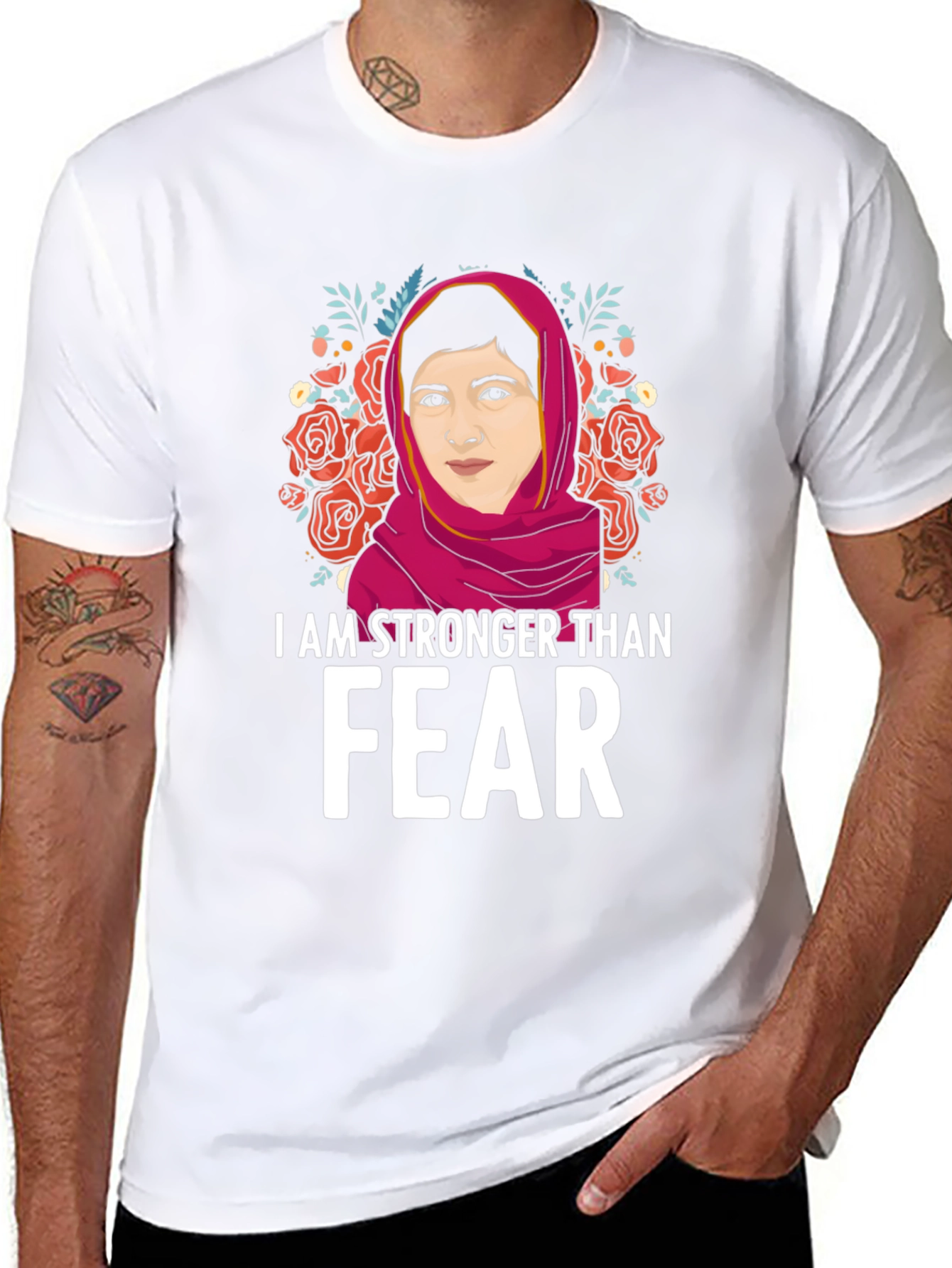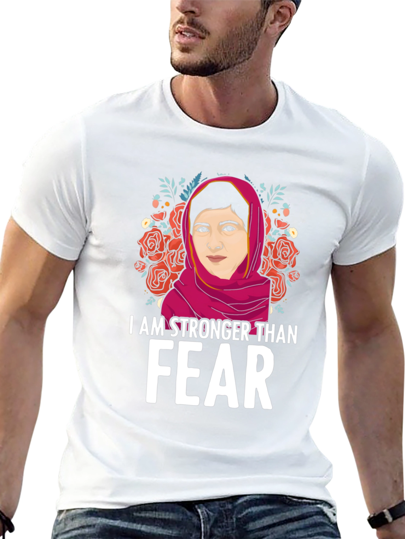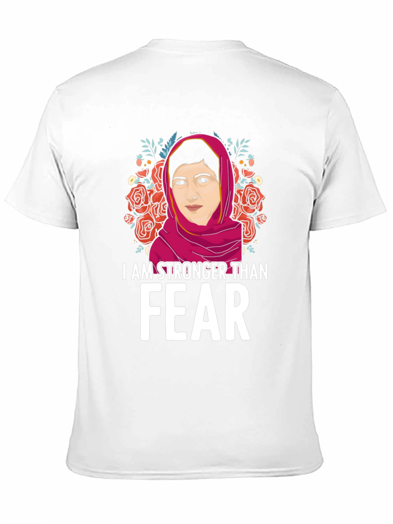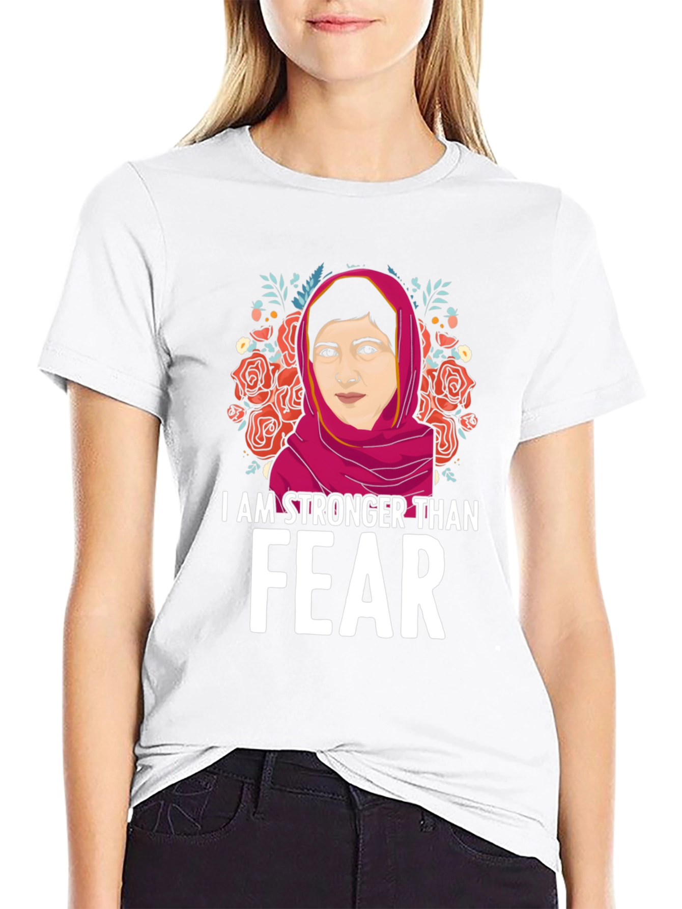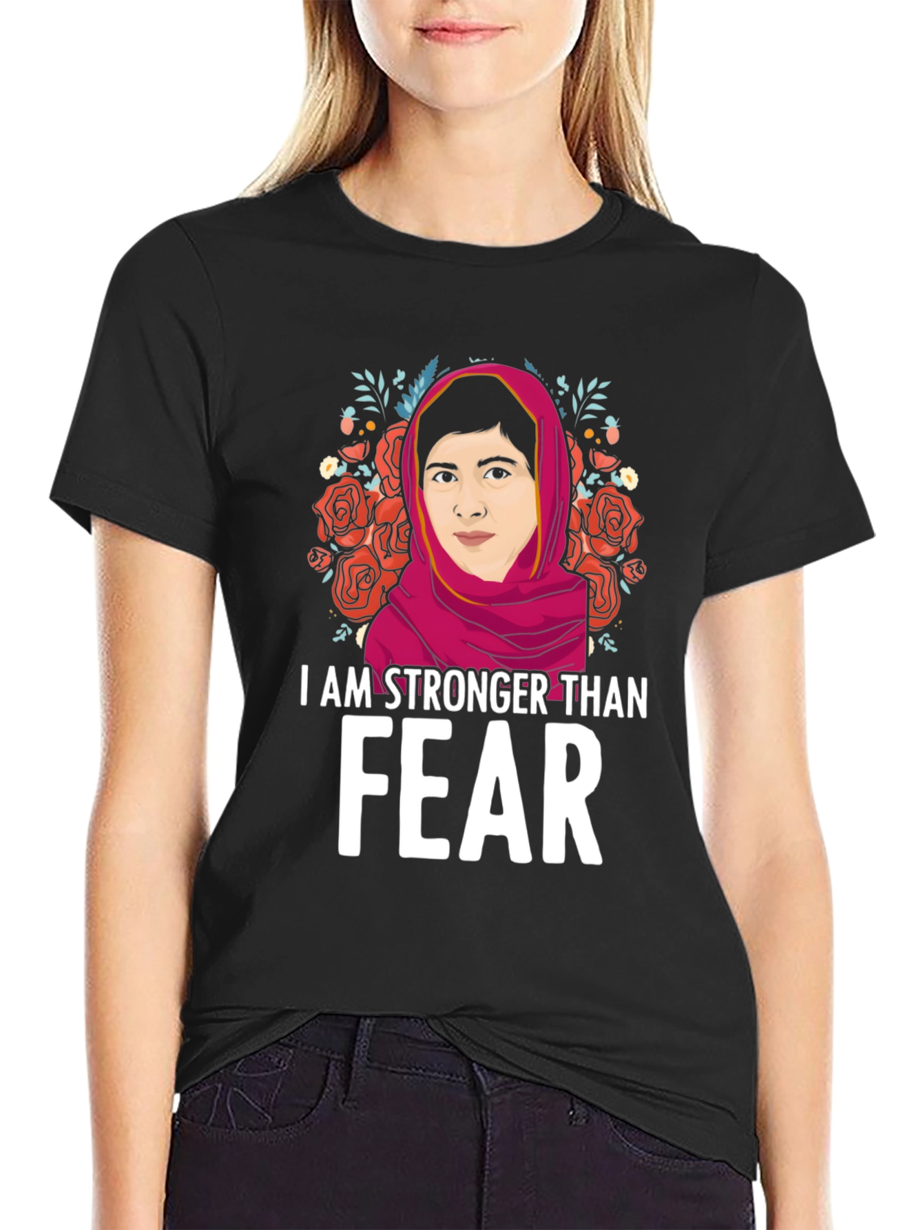 Show your strength and courage with this empowering graphic t-shirt! This black tee features a vibrant illustration of a strong woman framed by beautiful roses and foliage. The bold statement "I AM STRONGER THAN FEAR" is printed in white, making a powerful impact. This comfortable and stylish shirt is perfect for everyday wear, rallies, or as a gift for someone who inspires you. Made from soft, breathable fabric, this tee is sure to become a favorite. Let your clothing speak volumes with this meaningful piece!