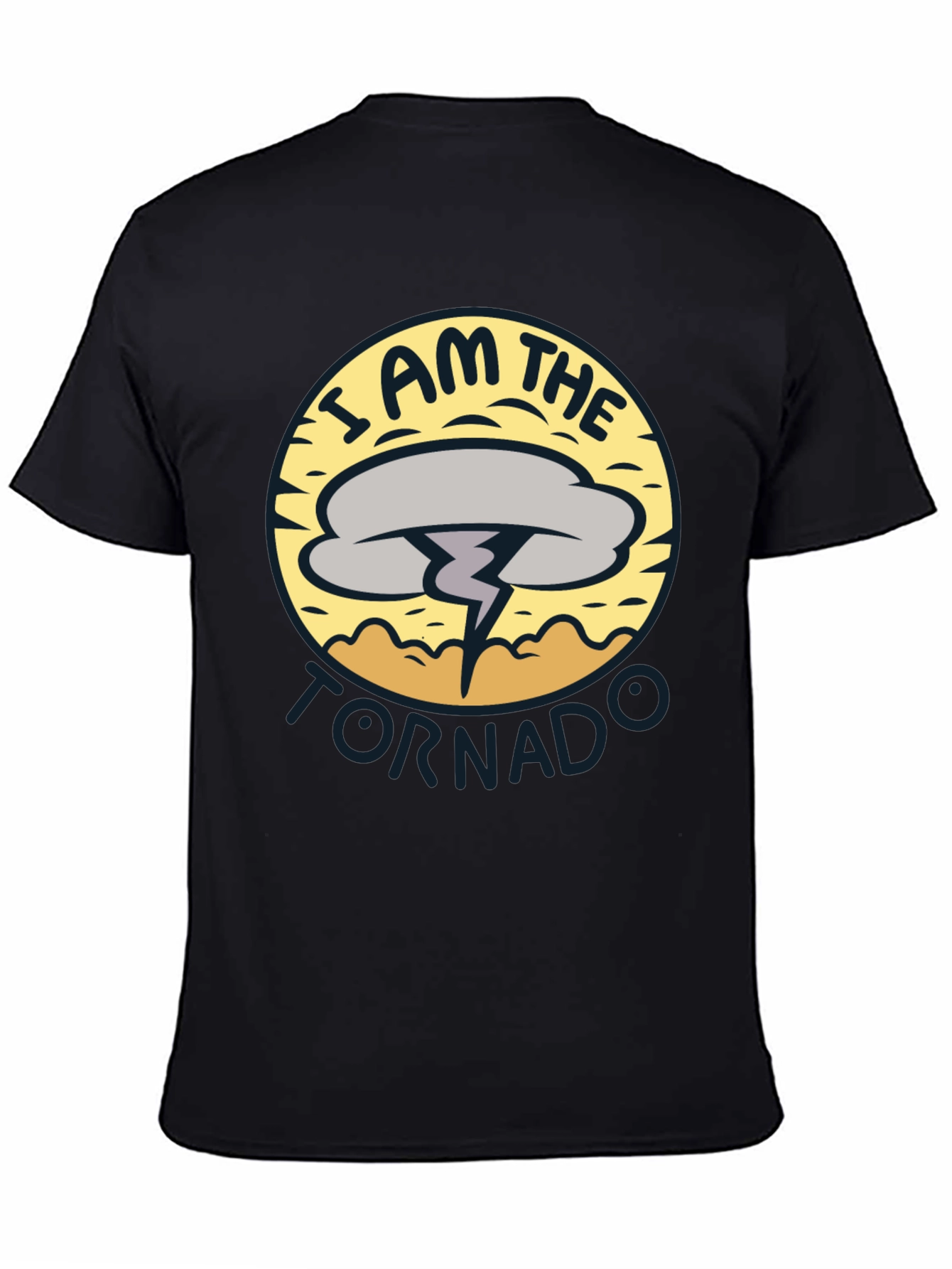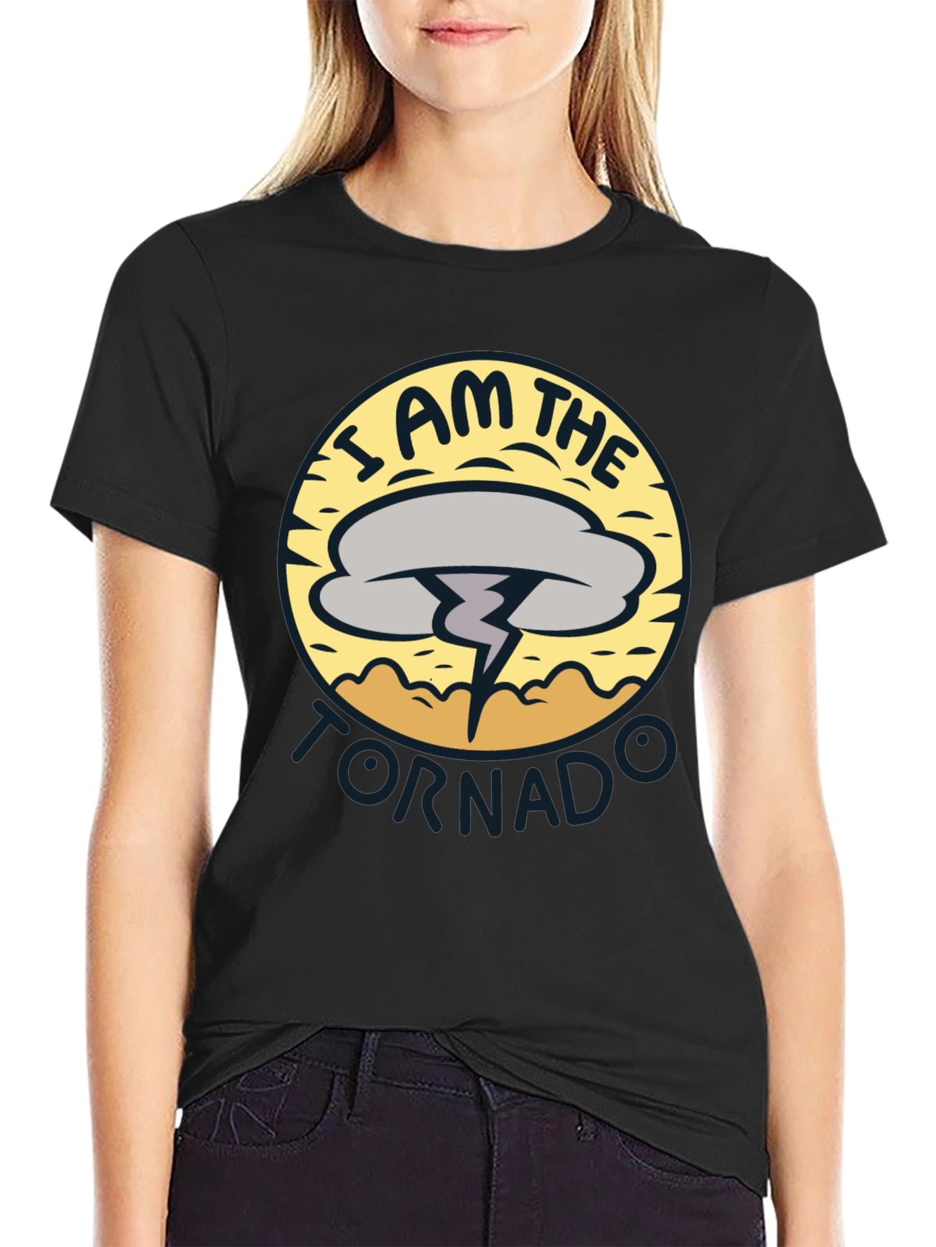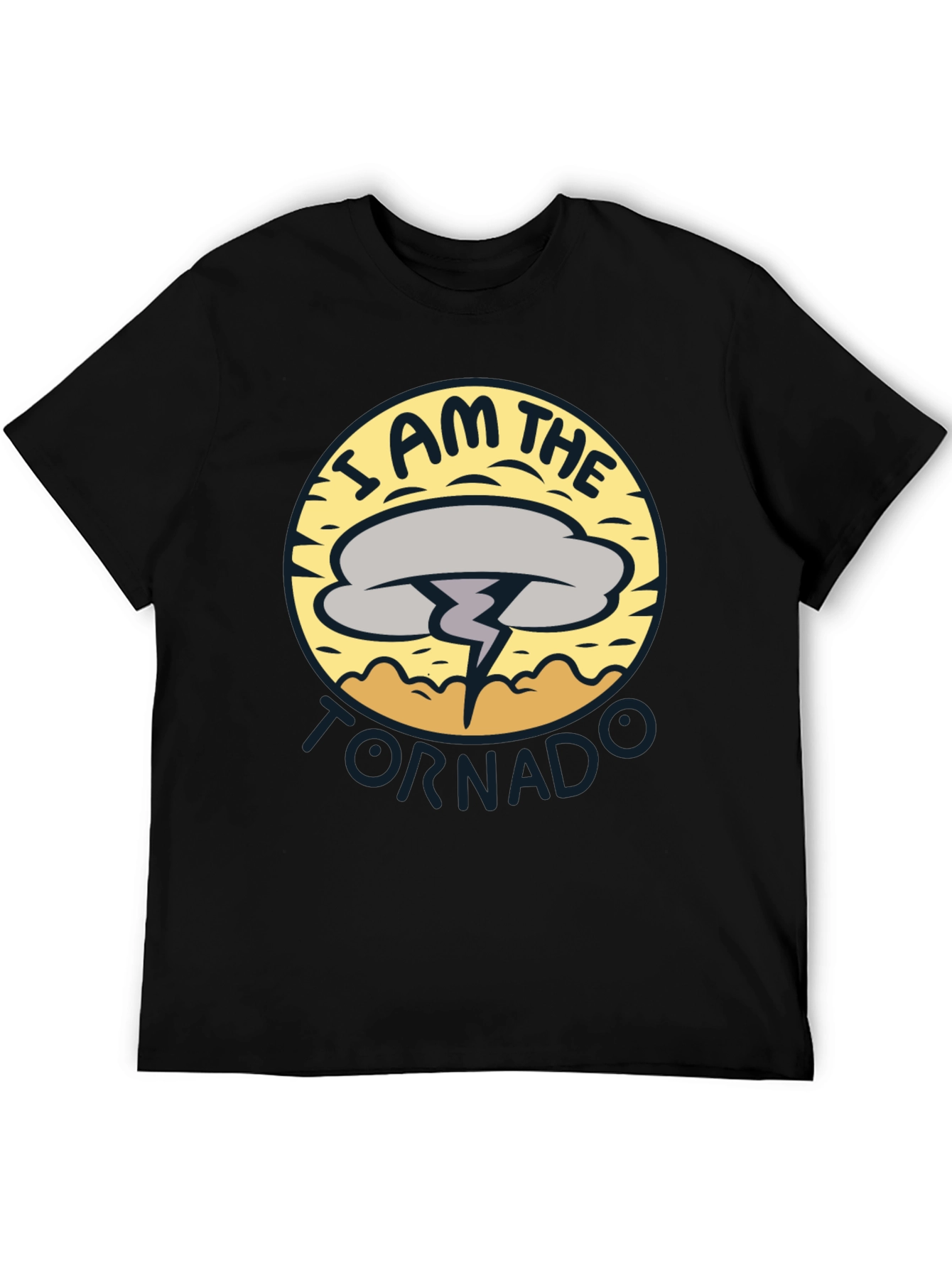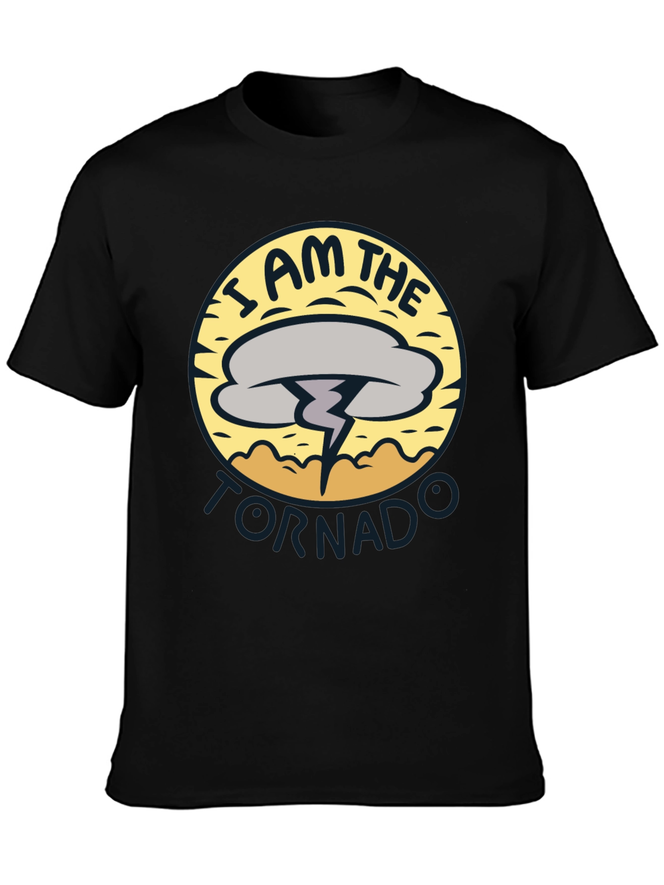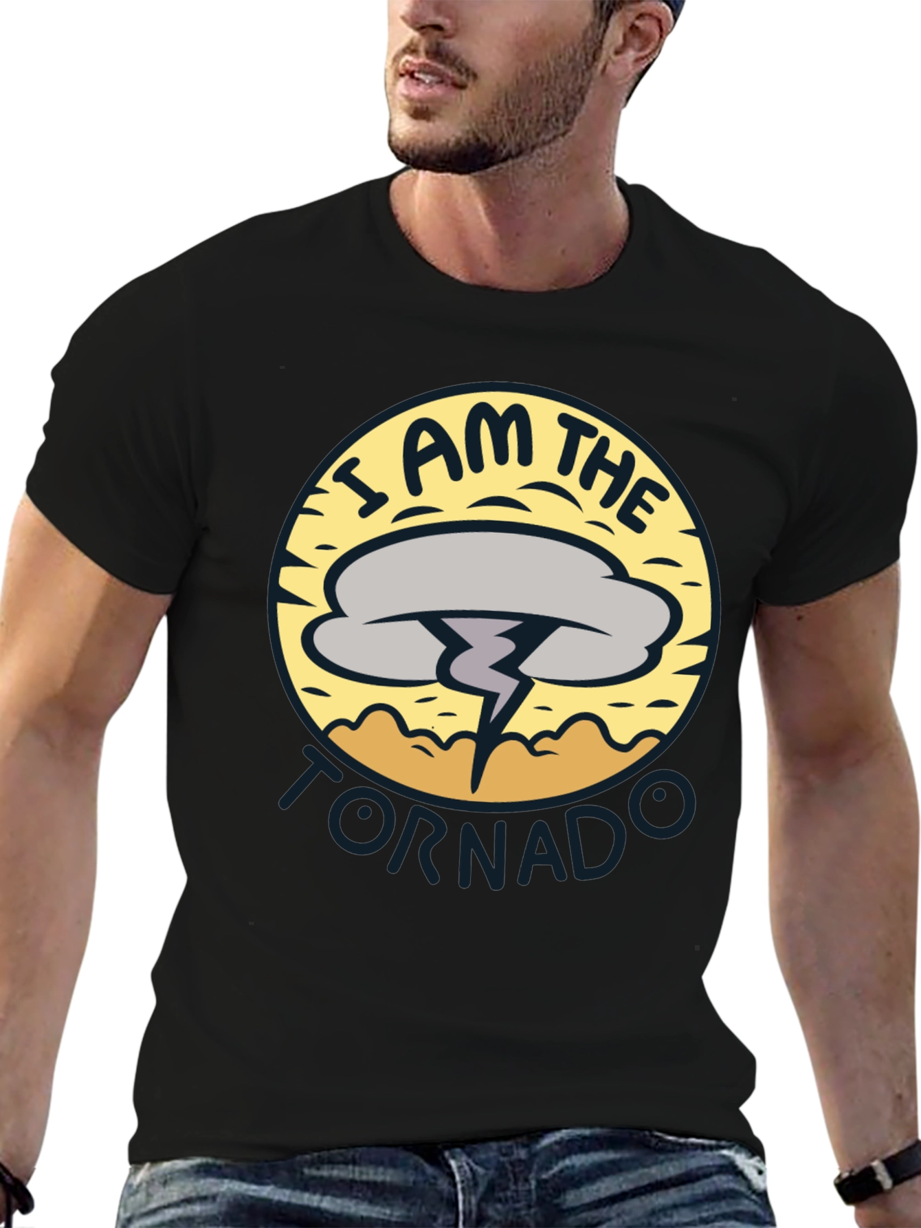 Show your inner strength with this unique graphic tee! This eye-catching black t-shirt features a striking design with a yellow circle enclosing a gray cloud with a lightning bolt. The text "I AM THE TORNADO" is written around the circle. Made from what appears to be a soft, comfortable cotton blend, this tee is perfect for everyday wear. Its relaxed fit ensures comfort and style, whether you're hitting the streets or relaxing at home. Make a statement and unleash your inner tornado with this one-of-a-kind t-shirt!