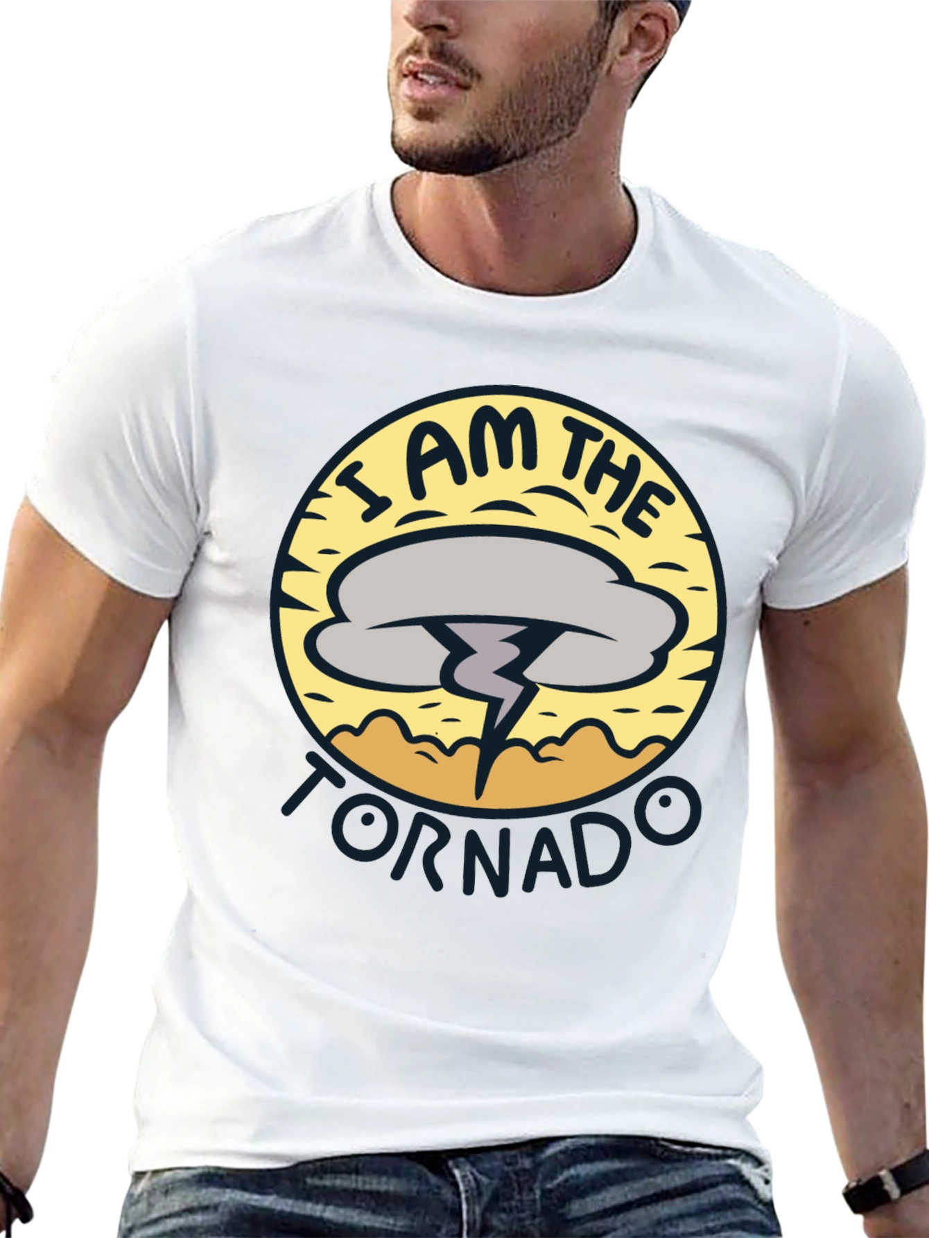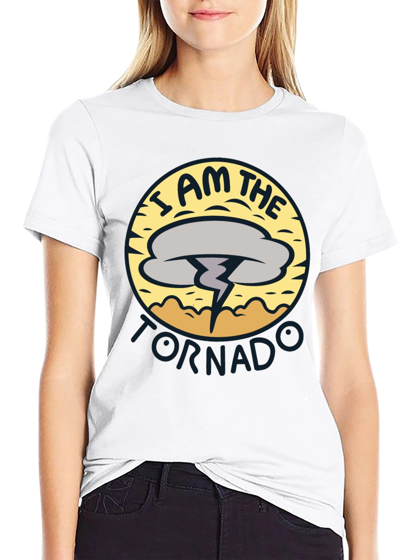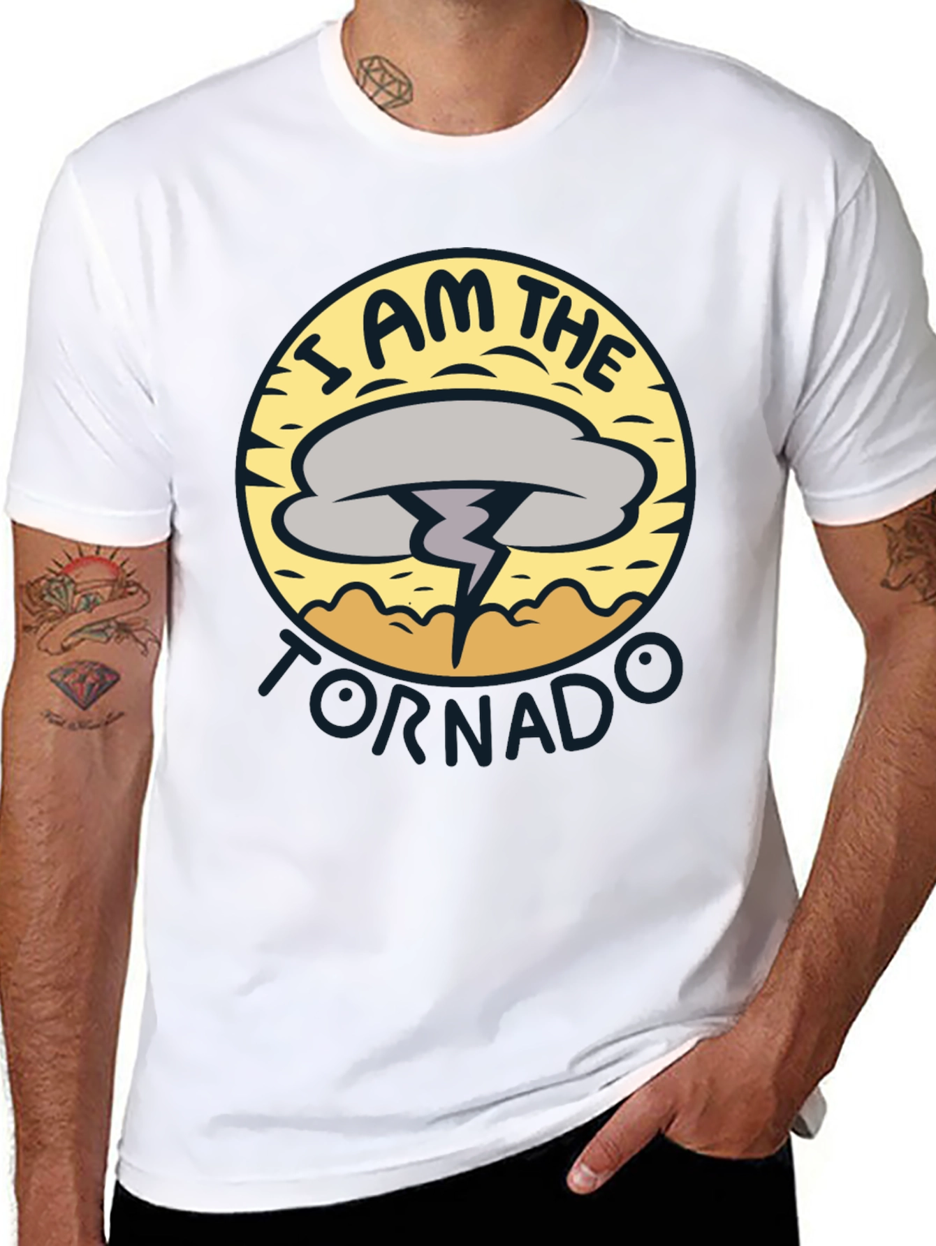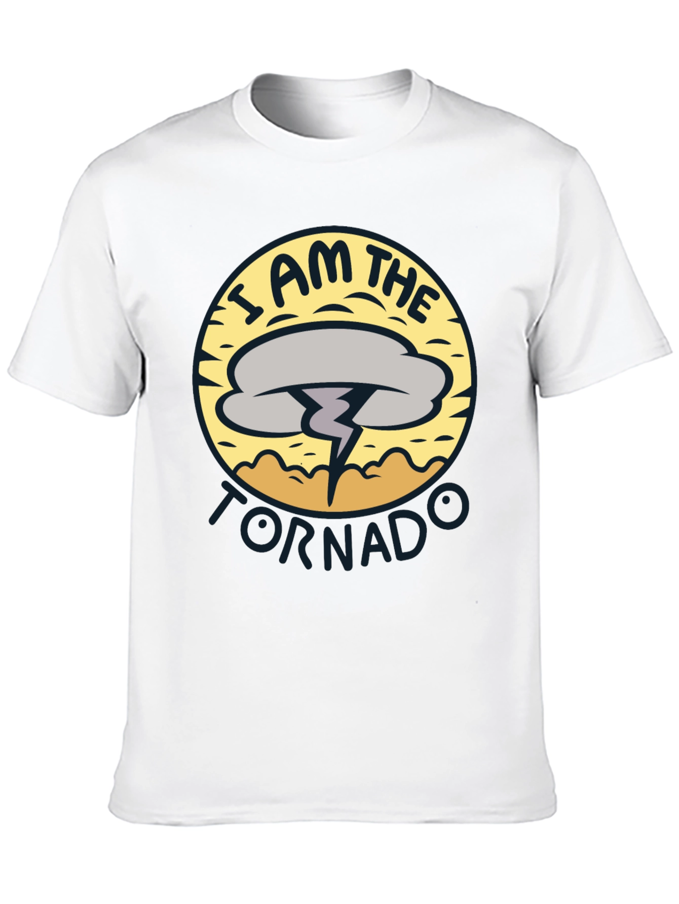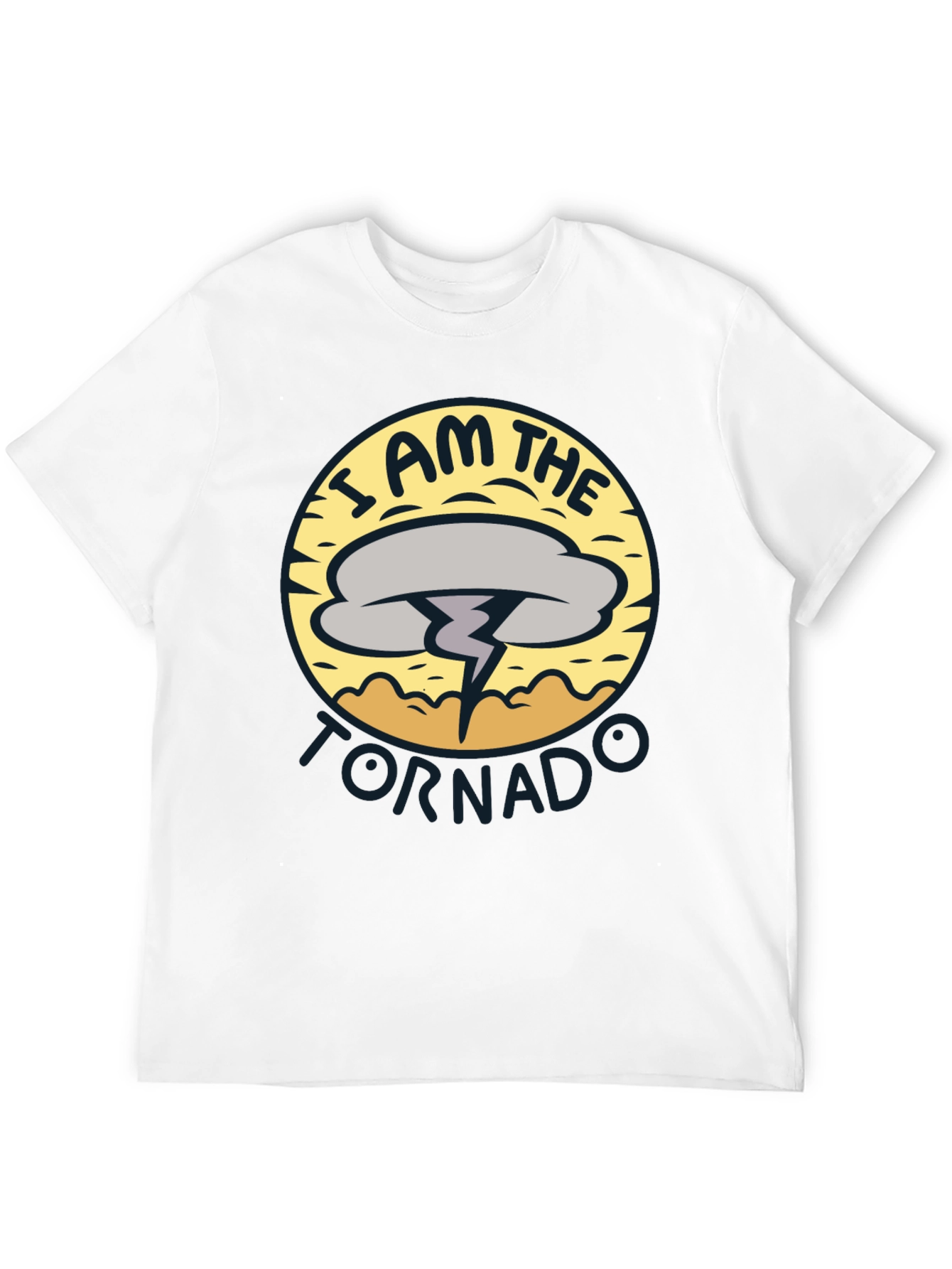 Show your inner strength with this unique graphic tee! This eye-catching black t-shirt features a striking design with a yellow circle enclosing a gray cloud with a lightning bolt. The text "I AM THE TORNADO" is written around the circle. Made from what appears to be a soft, comfortable cotton blend, this tee is perfect for everyday wear. Its relaxed fit ensures comfort and style, whether you're hitting the streets or relaxing at home. Make a statement and unleash your inner tornado with this one-of-a-kind t-shirt!