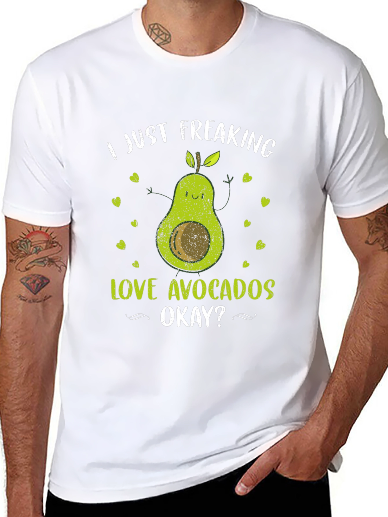 Show your love for avocados with this fun and stylish t-shirt. The black tee features a cartoon avocado graphic surrounded by small hearts, with the text "I JUST FREAKING LOVE AVOCADOS OKAY?". Made from a comfortable-looking fabric blend, this shirt is perfect for casual wear, avocado enthusiasts, or anyone who enjoys a touch of humor in their wardrobe. Wear it to your next brunch, avocado-themed party, or just out and about to show off your love for this delicious fruit. Get yours today and let everyone know how you feel about avocados!