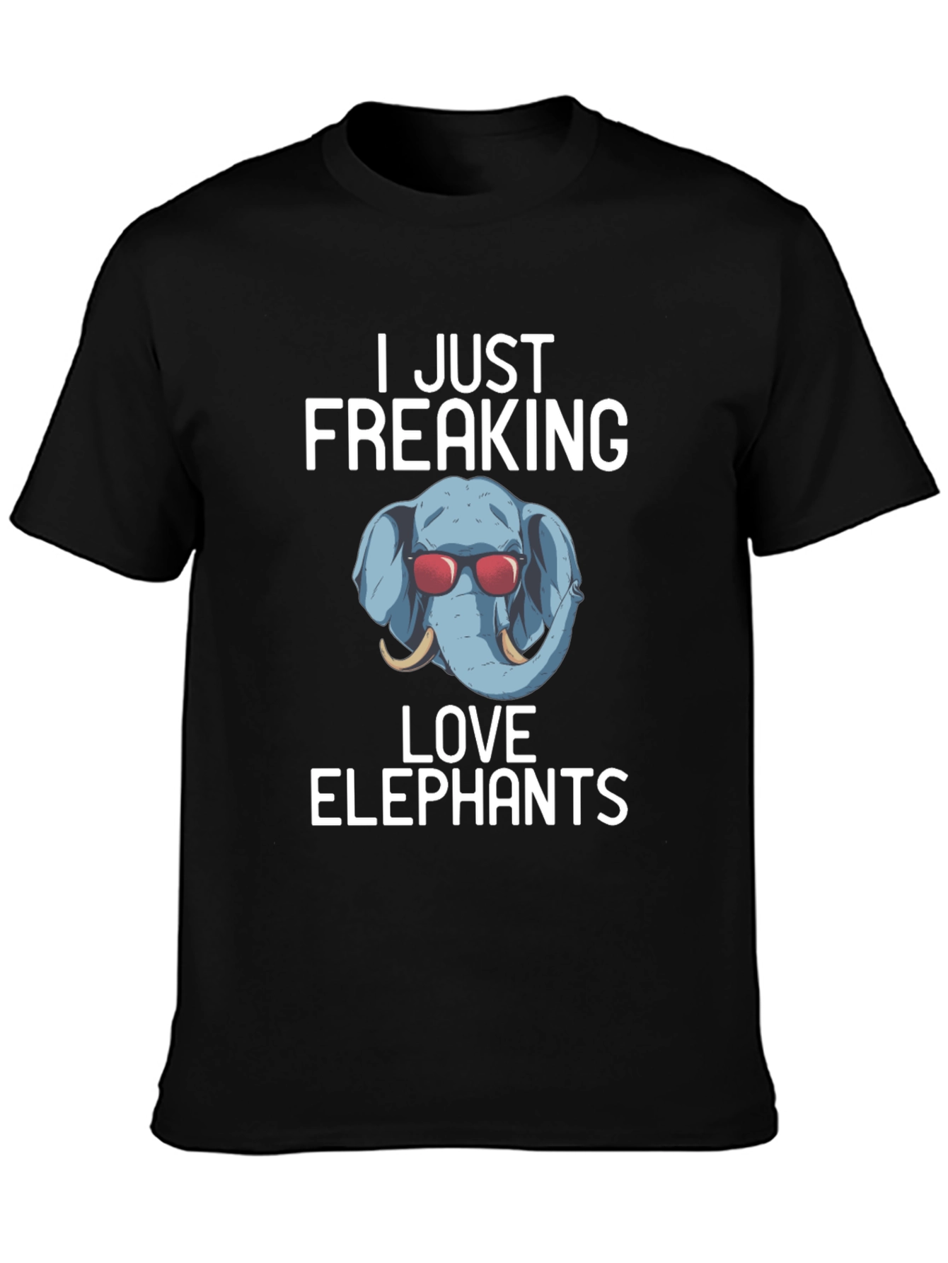 Show off your love for elephants with this fun and stylish t-shirt! The black tee features a graphic of an adorable blue elephant wearing red sunglasses, playfully positioned between the bold white text "I JUST FREAKING LOVE ELEPHANTS". Made from a soft and comfortable fabric, this shirt is perfect for casual wear. Whether you're heading to the zoo, hanging out with friends, or just relaxing at home, this t-shirt is sure to make a statement and spark conversations. A great gift for elephant enthusiasts!