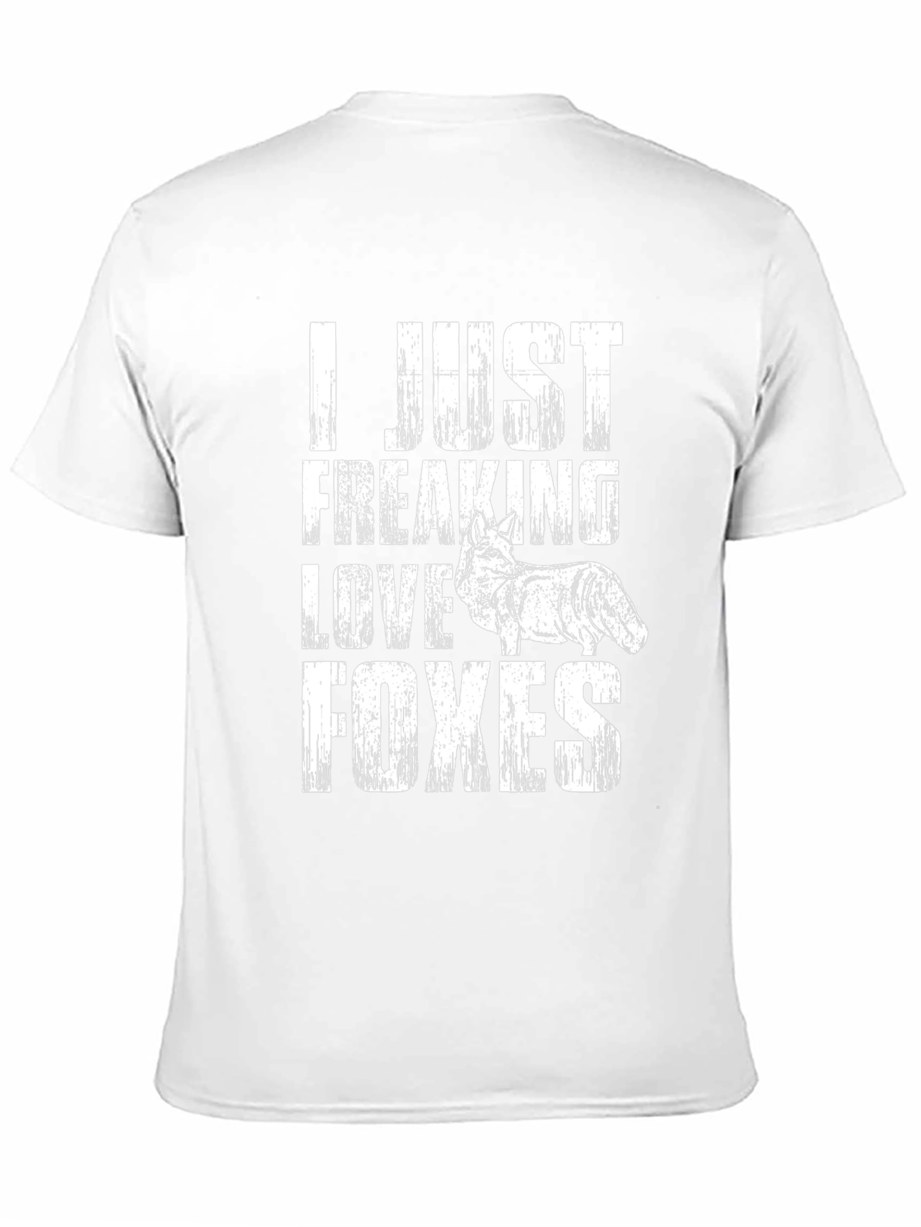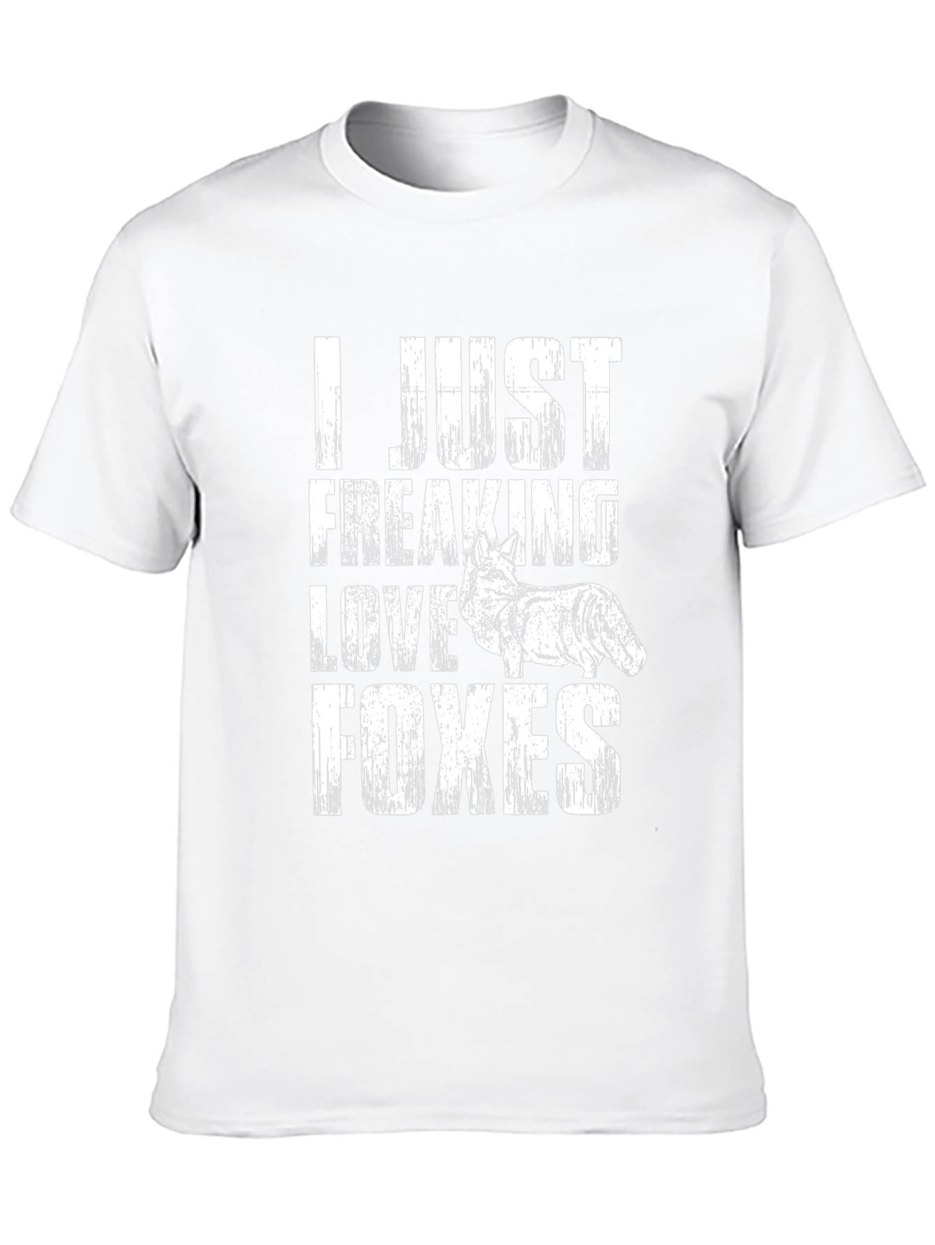 Express your love for foxes with this unique graphic tee! This black t-shirt features a distressed white print that reads "I JUST FREAKING LOVE FOXES," complete with an illustrated fox. The design has a vintage, worn-in feel, adding to its casual appeal. Made from a soft, comfortable fabric, this shirt is perfect for everyday wear. It's ideal for casual outings, lounging at home, or as a fun gift for any fox enthusiast. Show off your passion for these adorable creatures in style with this eye-catching and comfortable t-shirt.