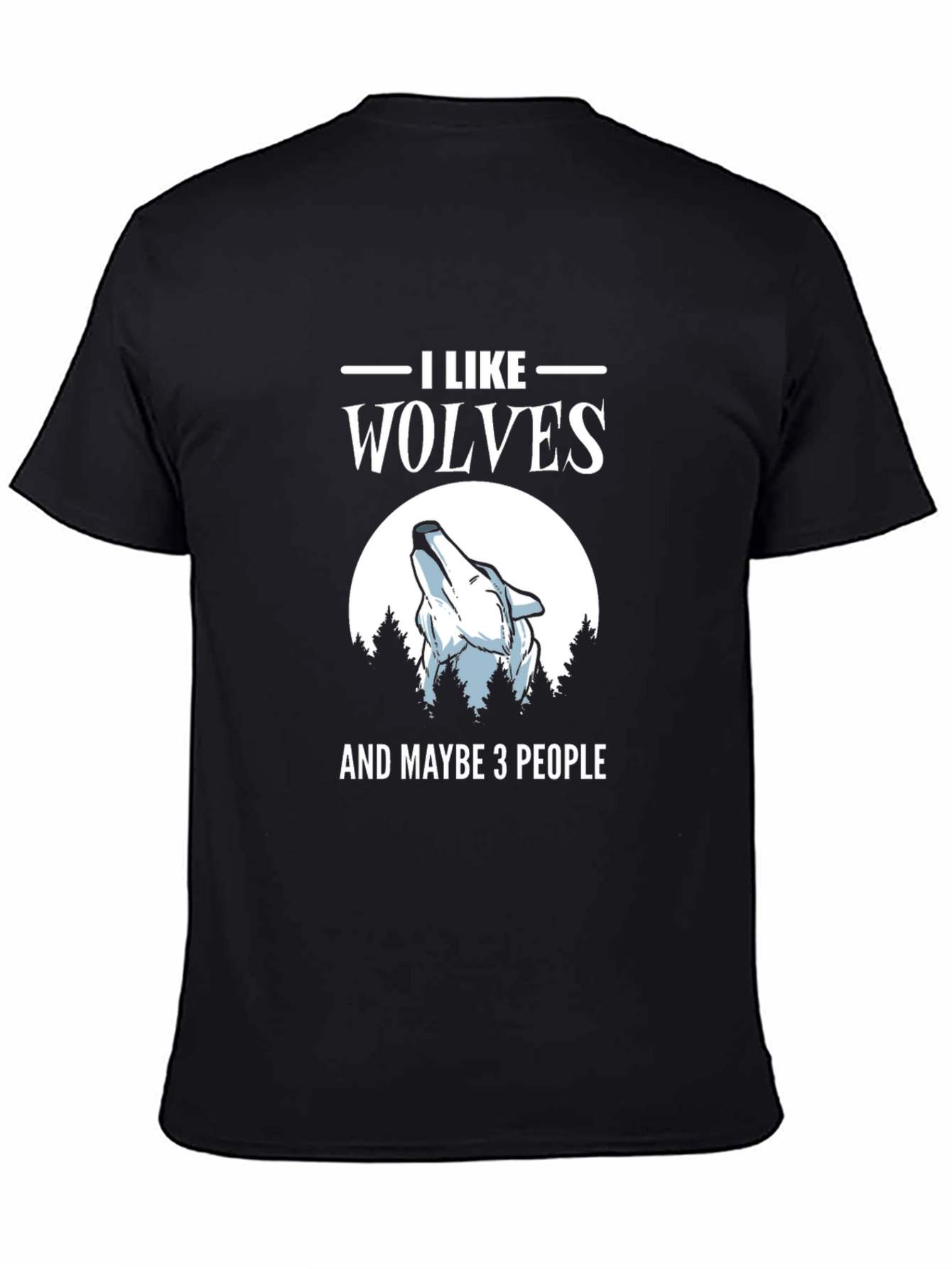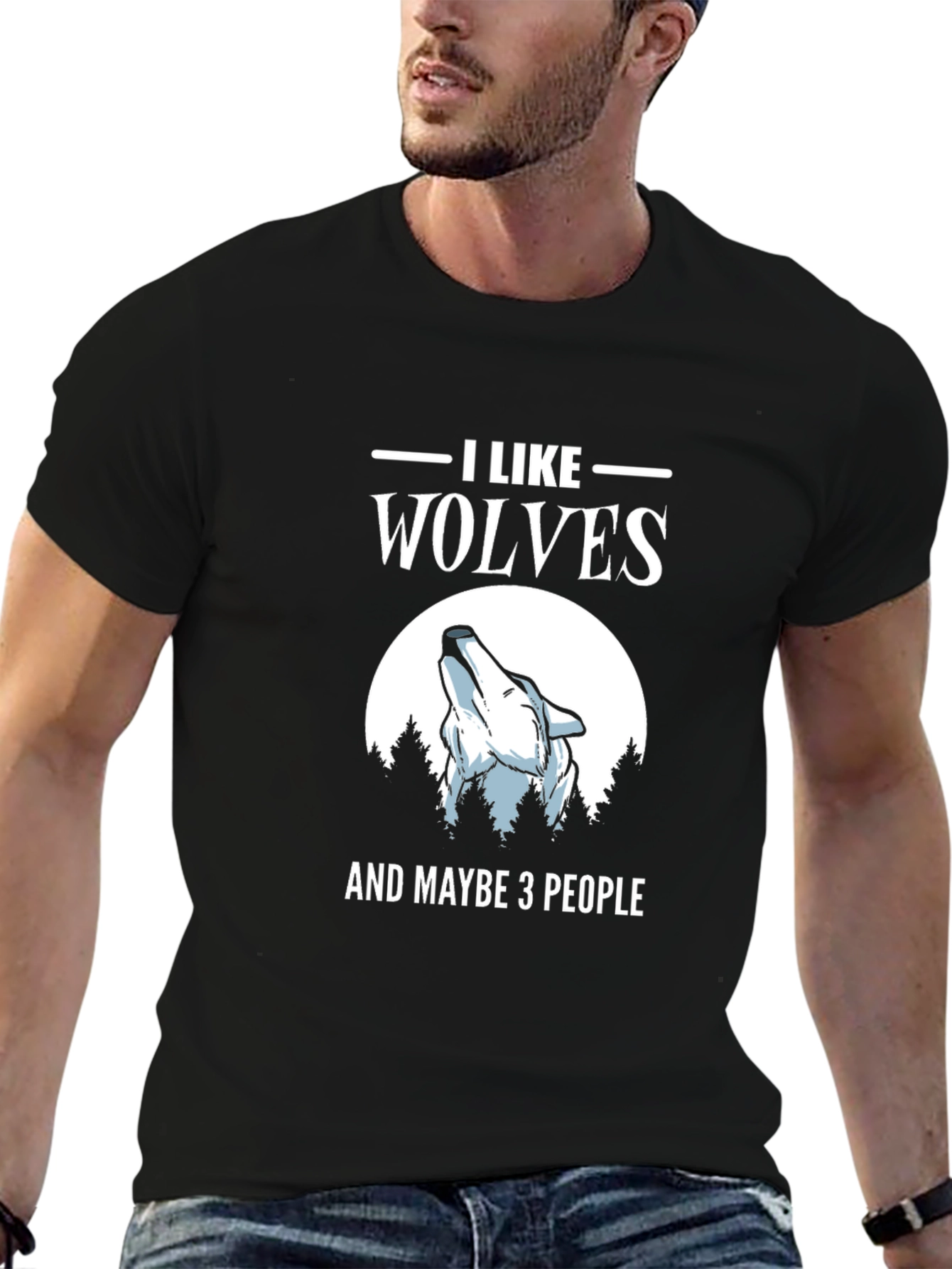 Show your love for wolves with this unique graphic tee! This black t-shirt features a bold design with the phrase "I LIKE WOLVES AND MAYBE 3 PEOPLE" printed in white, complemented by an illustration of a howling wolf against a moonlit backdrop of silhouetted trees. Made from what appears to be a comfortable cotton blend, this shirt is perfect for casual wear. The classic fit makes it a versatile addition to any wardrobe. Wear it to express your appreciation for wildlife or as a humorous statement piece. A great gift for wolf enthusiasts!