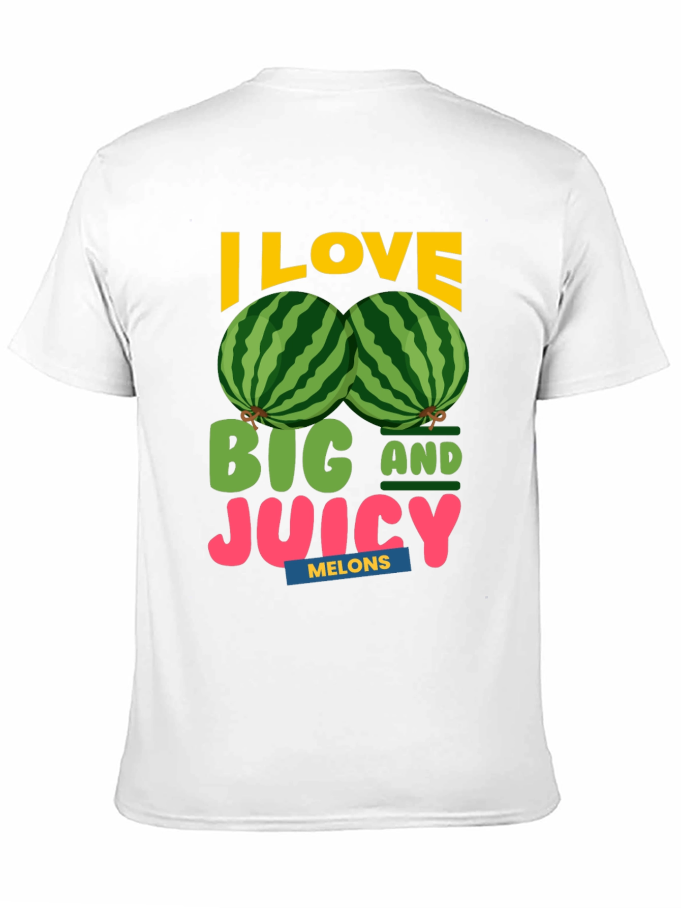 Show off your playful side with this eye-catching graphic tee! This black t-shirt features a bold and colorful design with the phrase 'I LOVE BIG AND JUICY' above an illustration of two watermelons. The word 'MELONS' is prominently displayed in a contrasting box, completing the playful message. Made from a soft, comfortable fabric, this tee is perfect for casual wear, parties, or any occasion where you want to make a statement. Pair it with your favorite jeans or shorts for a fun and flirty look that's sure to turn heads.