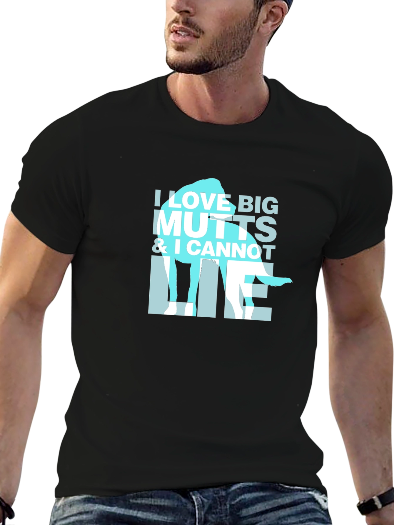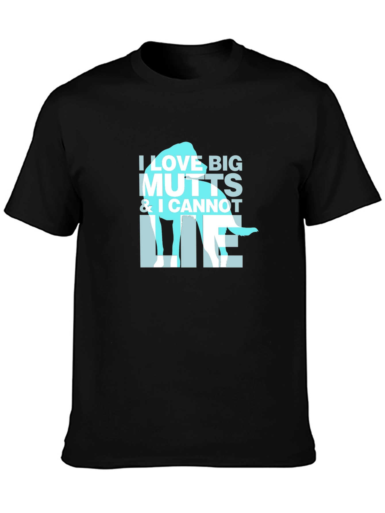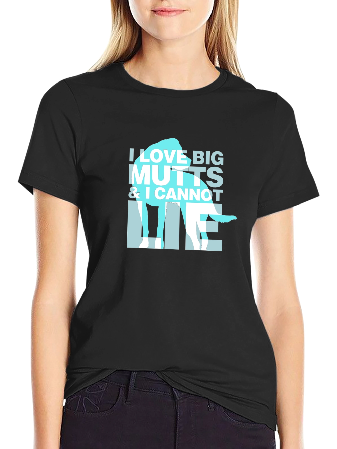 Show your love for dogs with this fun graphic tee. The black t-shirt features a playful turquoise design with the phrase "I LOVE BIG MUTTS & I CANNOT LIE" alongside a dog silhouette. Made from a comfortable fabric, this shirt is perfect for casual wear, dog park visits, or just lounging around. The unique design is sure to spark conversations and bring smiles. Express your passion for furry friends with this trendy and humorous tee!