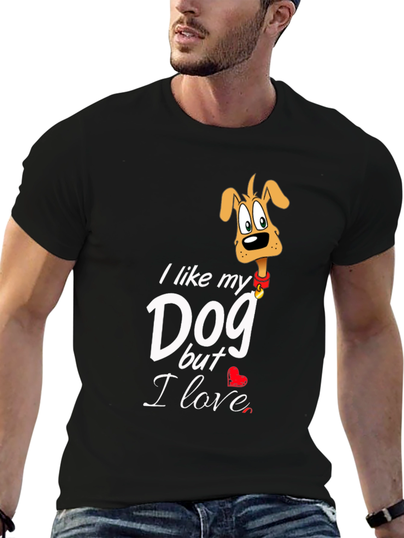 Show your love for your furry friend with this stylish black graphic tee! The shirt features a playful cartoon dog graphic and the text "I like my Dog but I love". Made from comfortable fabric, this t-shirt is perfect for casual wear and dog lovers. It is suitable for a day at the park, running errands, or just relaxing at home with your canine companion. Get yours today and let the world know how much you care about your dog!