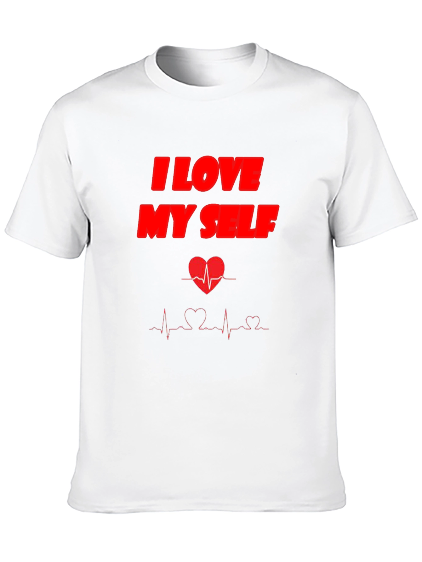 Show your self-love with this stylish black graphic t-shirt. The shirt features a bold, red "I LOVE MY SELF" text design, followed by a heart symbol with an EKG waveform pattern, also in red. This crew neck tee is perfect for casual wear, expressing self-affirmation and spreading positive vibes. Made from comfortable fabric, this shirt is suitable for everyday use and makes a great statement piece. Wear it to social gatherings, casual outings, or even as a motivational reminder to yourself.