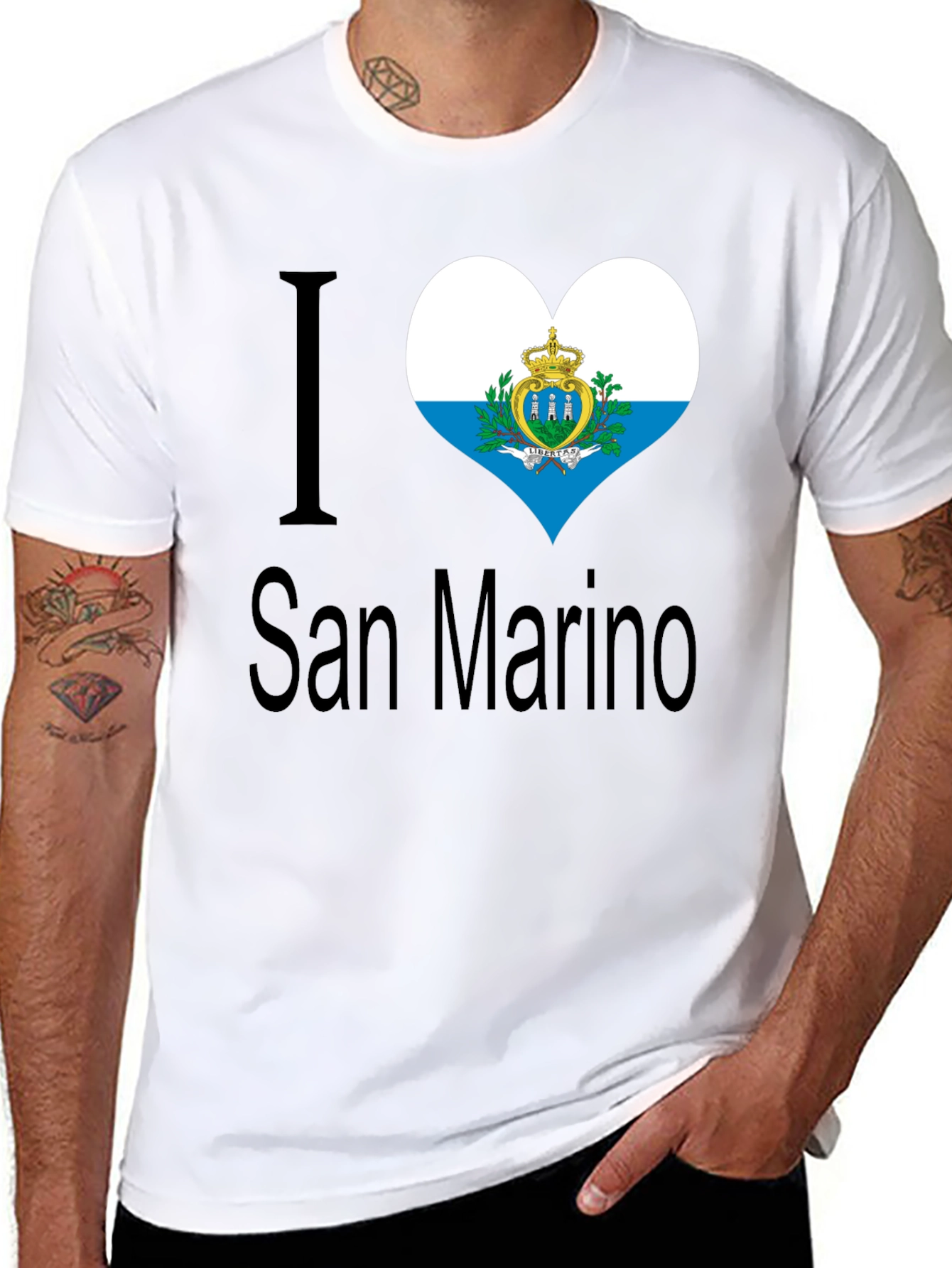 Show your love for San Marino with this stylish black t-shirt. The design features a bold "I" followed by a heart incorporating the flag of San Marino. Below, the words "San Marino" complete the message. This eye-catching design is printed on a comfortable, casual-fit tee, perfect for everyday wear or as a souvenir. The shirt has short sleeves and a crew neck, offering a classic silhouette suitable for various occasions. Whether you're a proud citizen or simply admire the country, this t-shirt lets you wear your passion with pride.